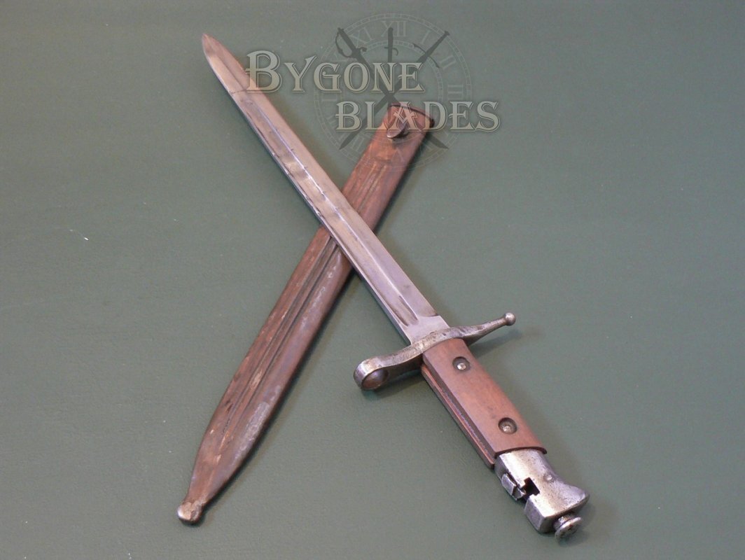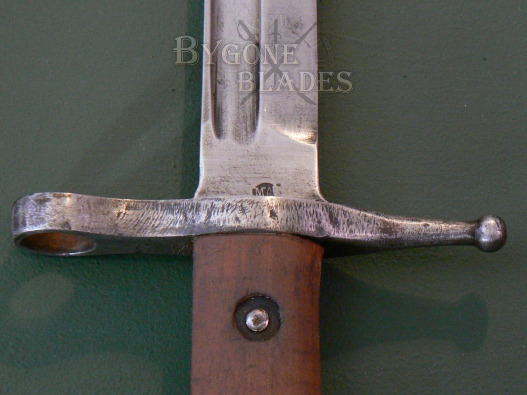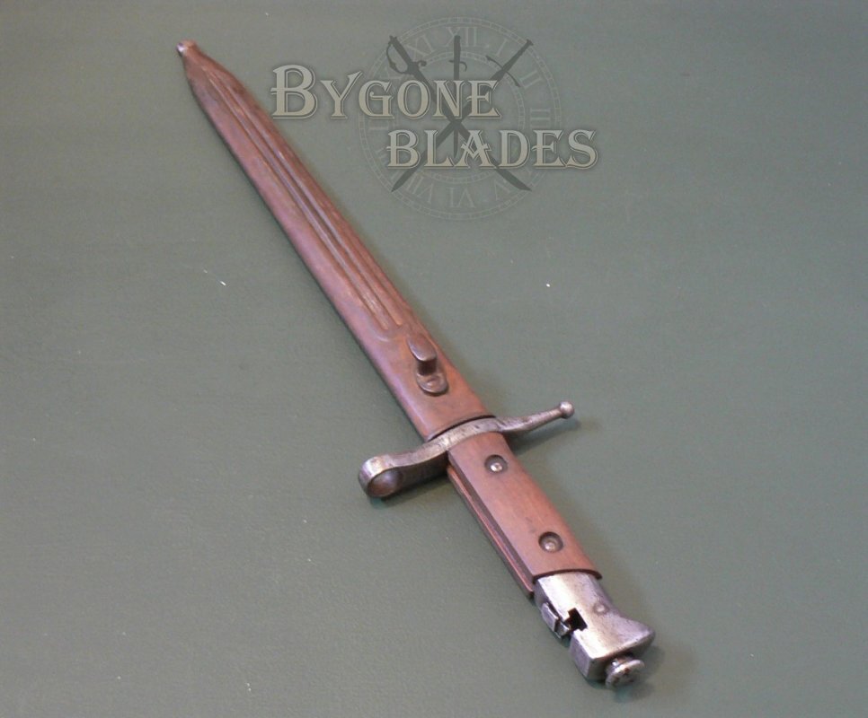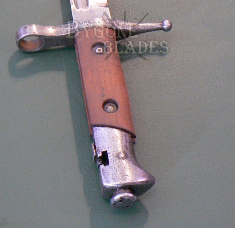 This bayonet was for use with the M1891 TS Carbine 2nd variant which had a unique transverse bayonet lug requiring the bayonet to be placed over the muzzle, then slid sideways on to the bayonet lug from left to right. This arrangement required the bayonet's press stud to be at the rear of the pommel.