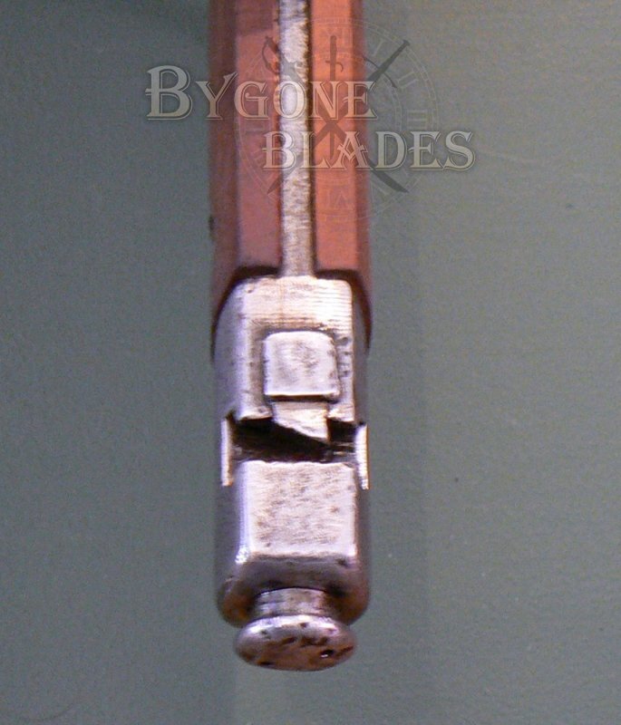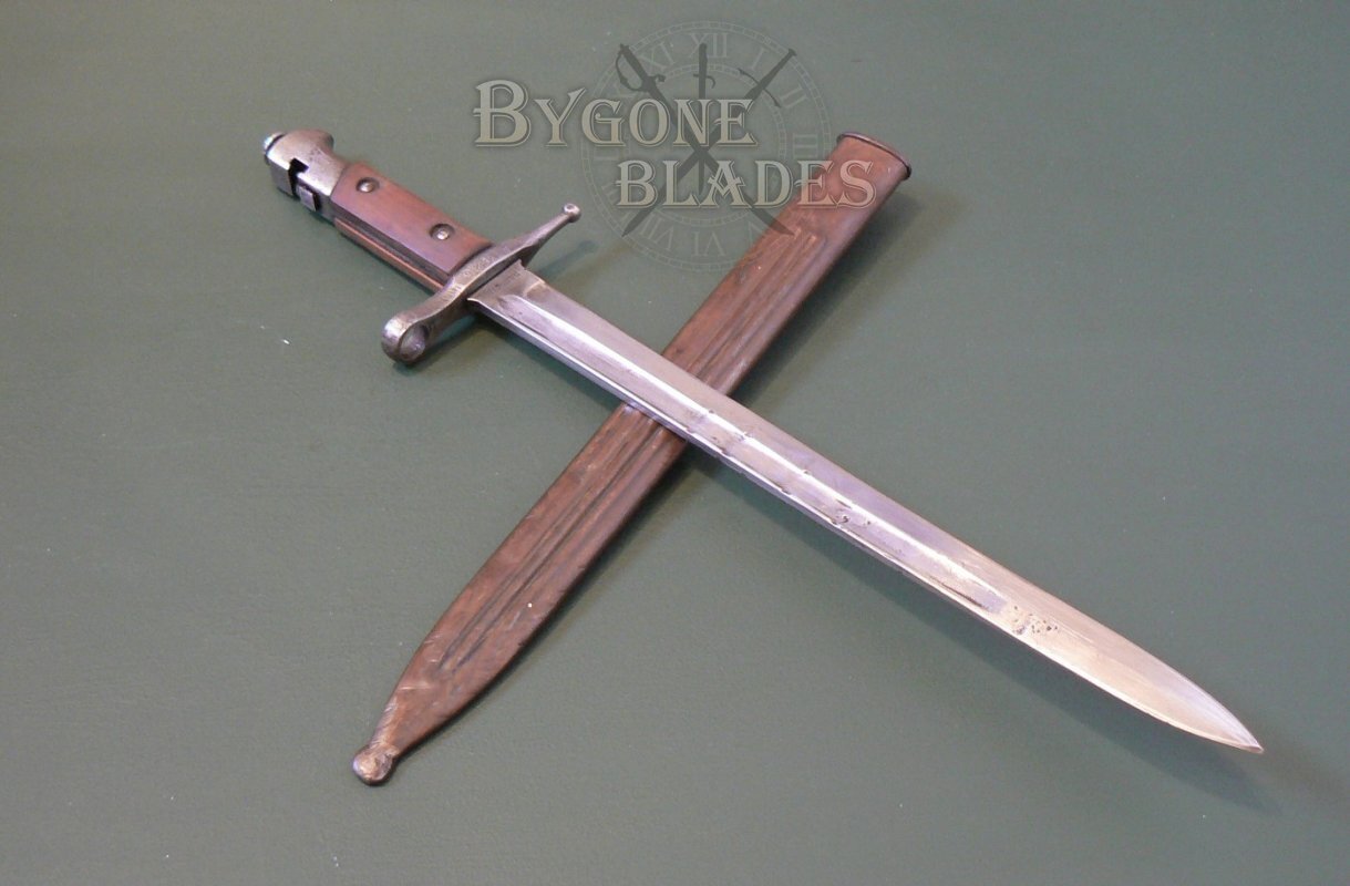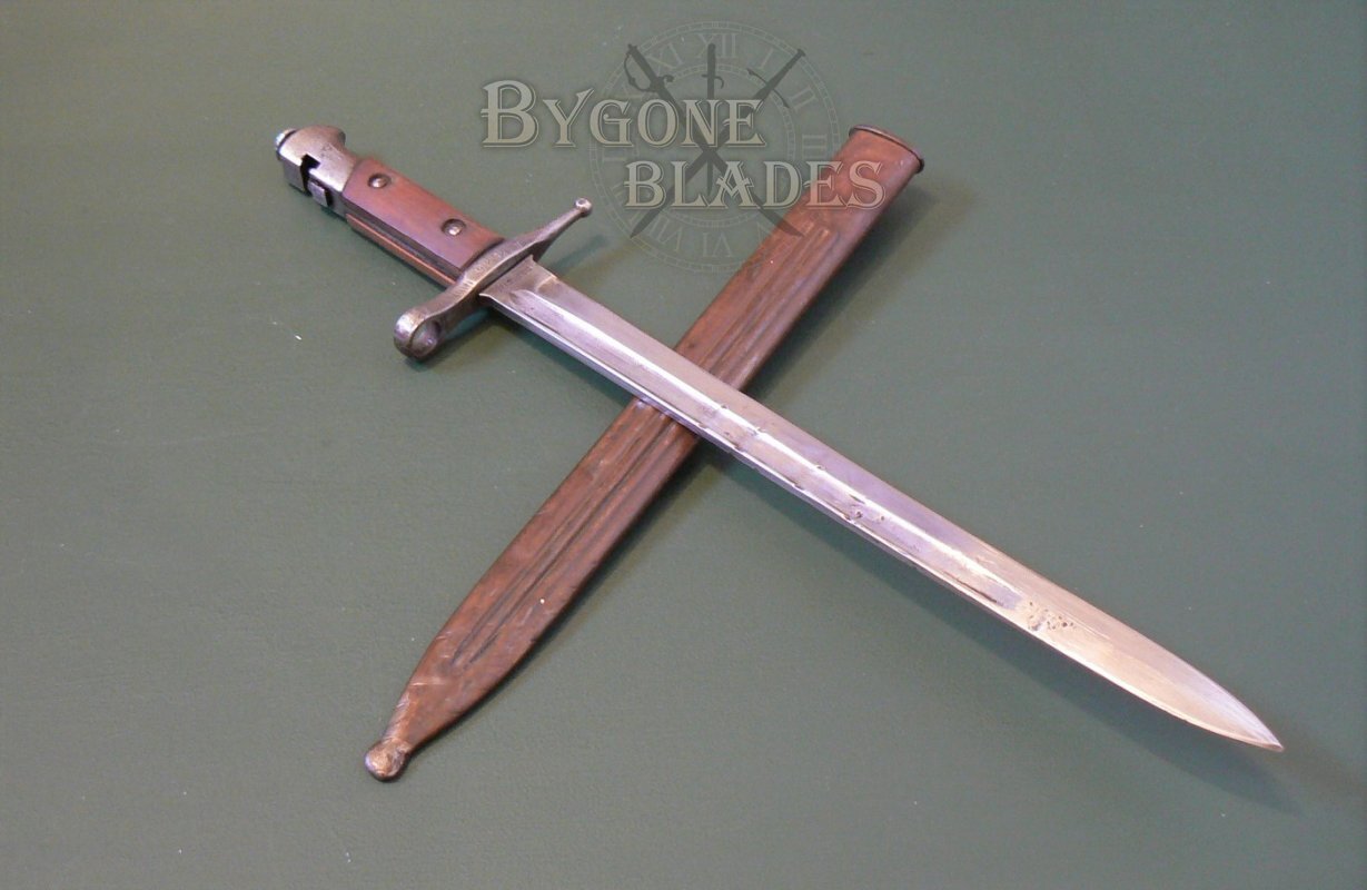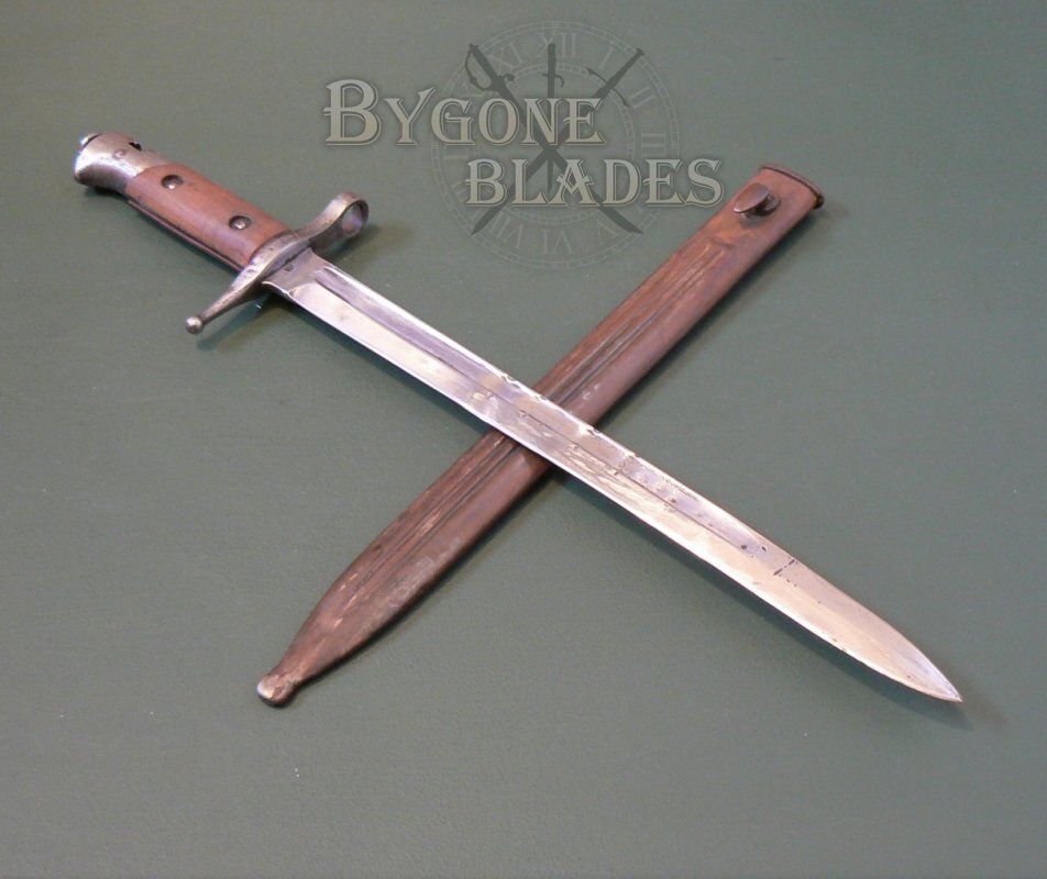 This bayonet was for use with the M1891 TS Carbine 2nd variant which had a unique transverse bayonet lug requiring the bayonet to be placed over the muzzle, then slid sideways on to the bayonet lug from left to right. This arrangement required the bayonet's press stud to be at the rear of the pommel.