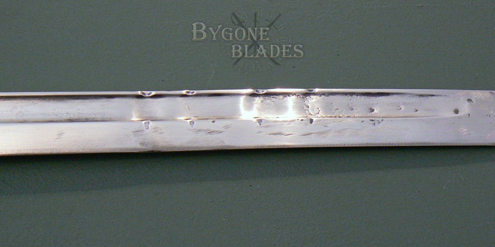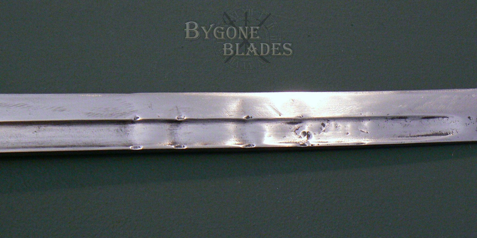 The 298mm single edged blade has a deep single fuller on both sides and a “T”-shaped spine and is clean and bright. The blade has sustained some damage with four uniform indentations along the blade and spine on both sides. The ricasso is marked with the word “Brescia” and the obverse ricasso bears an oval cartouche containing the letters “MA.”