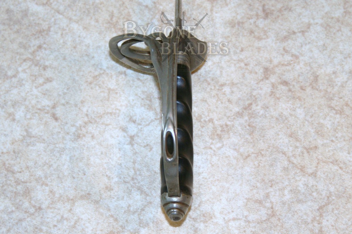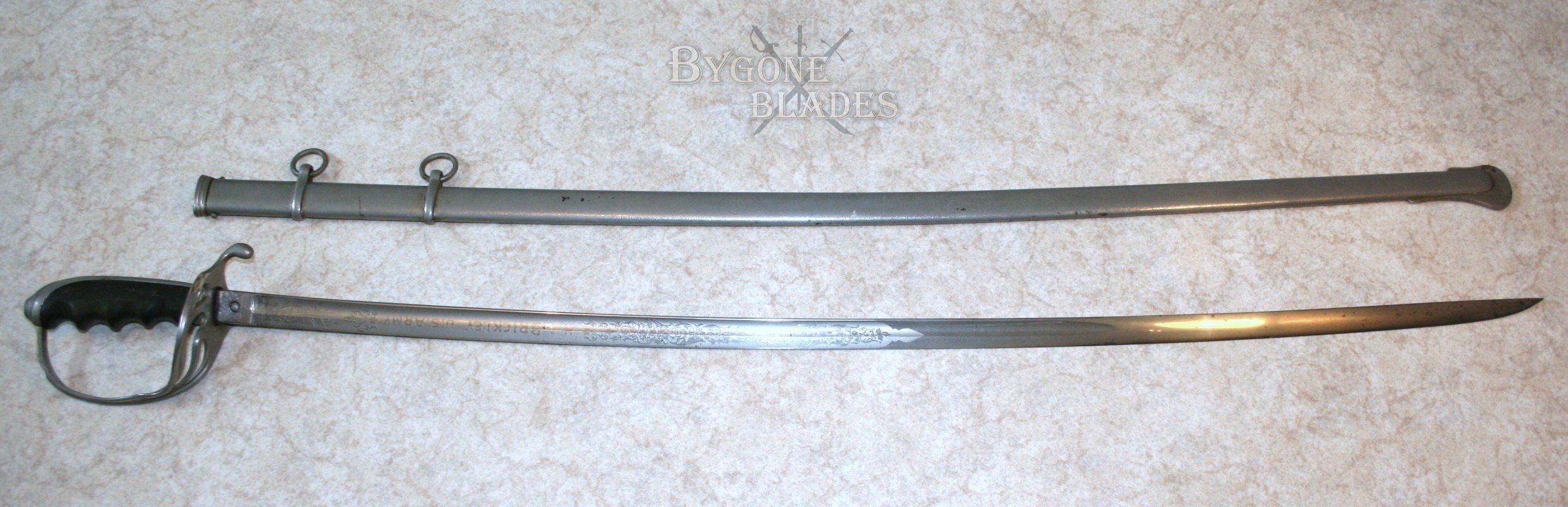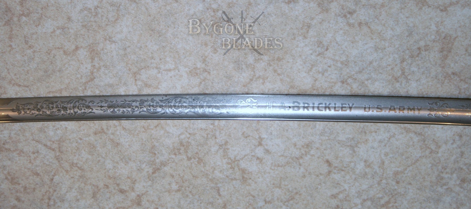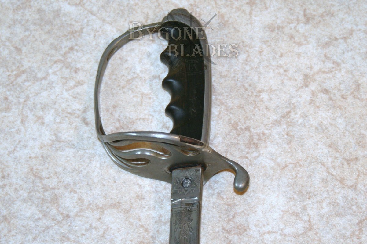 This 1902 pattern American Army Officers’ sword bears the name H. A. Brickley. Henry Augustus Brickley attended Harvard University before enrolling in the infantry at the outbreak of WW1. Brickley passed out of Westpoint Academy in 1914. He saw action in France during WW1 and was promoted to the rank of Captain. After the war he became military attaché to Romania. Henry Brickley re-enlisted in the army at the outbreak of WWII.