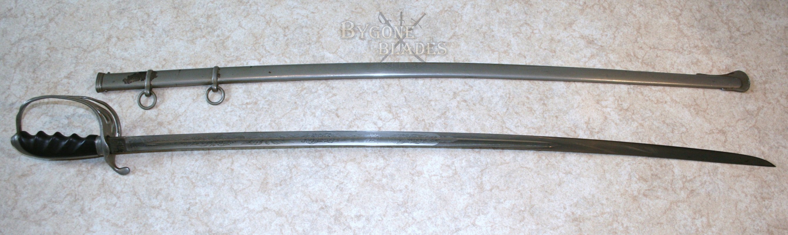The plated steel scabbard retains over 90% of its original plating.