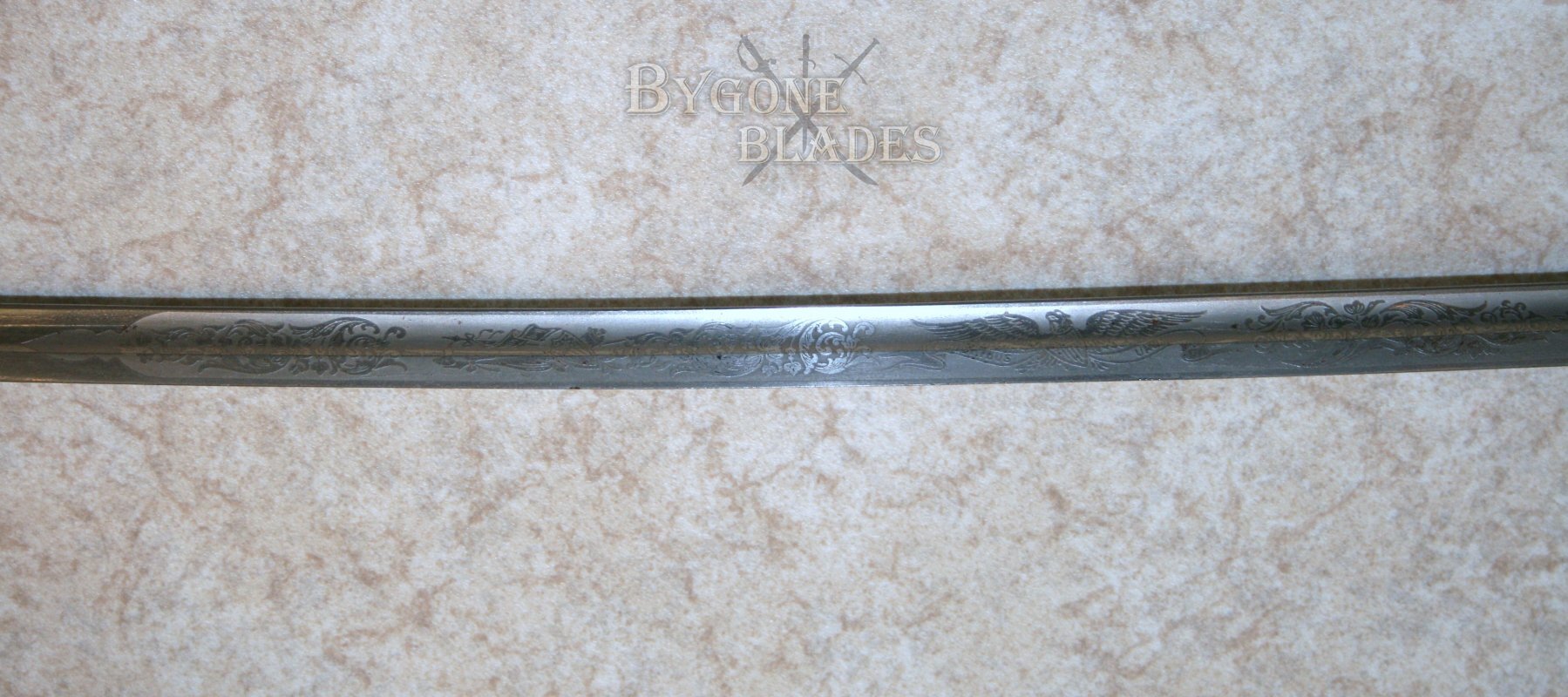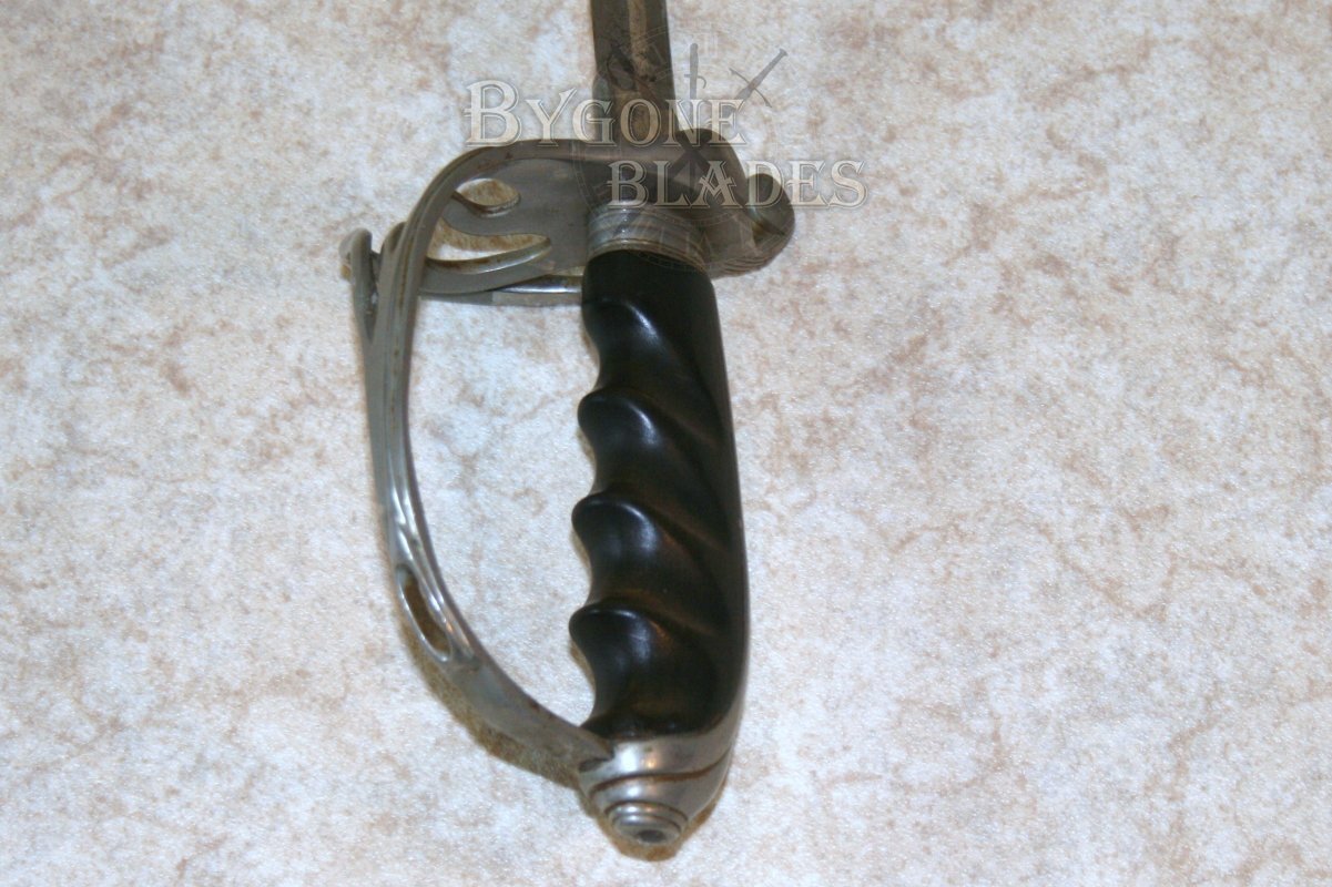 The swords’ finely etched 36.25 inch / 92 cm curved blade was made by Weyersberg and Kirschbaum of Solingen, Germany and is decorated with fine scroll work, furled flags and crossed cannon as well as the American eagle. The blade is in excellent condition with only very mild age tarnishing. The blade is firm in the hilt.