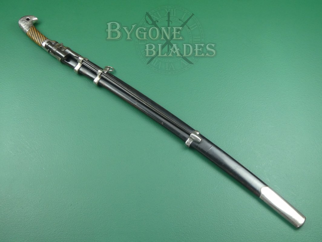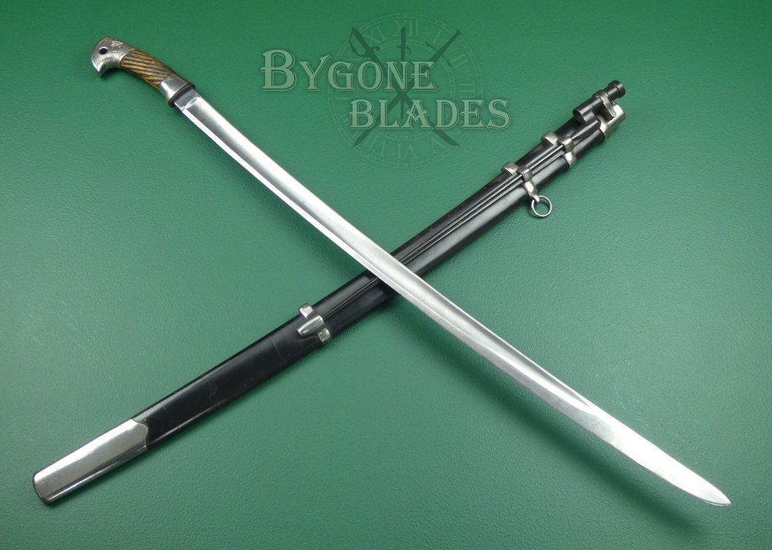 The shashka is complete with its scabbard with plated steel mounts and Model 1891 Mosin Nagant bayonet. The M1891 is one of the scarcer Mosin nagant carbine bayonets. The sword was worn in a scabbard suspended with the edge uppermost. The scabbard is in very good condition and the sword sheathes and draws smoothly and is held firmly within.
