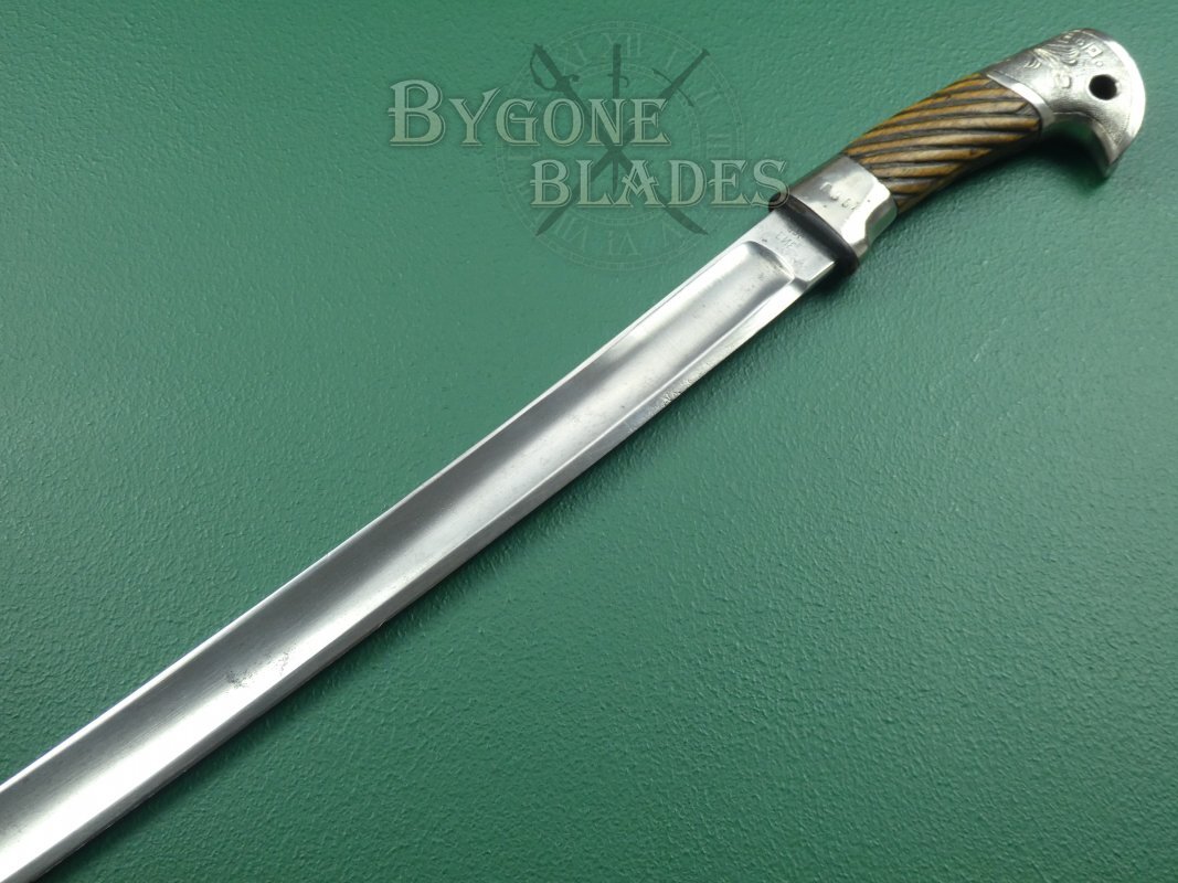 The 810mm single-edged blade has a flat spine with an upper false edge and terminates in an asymmetric spear point. The blade has a broad single fuller on each side and is in good condition. There are some sharpening scratches and edge nicks consistent with use and the edge remains very sharp.