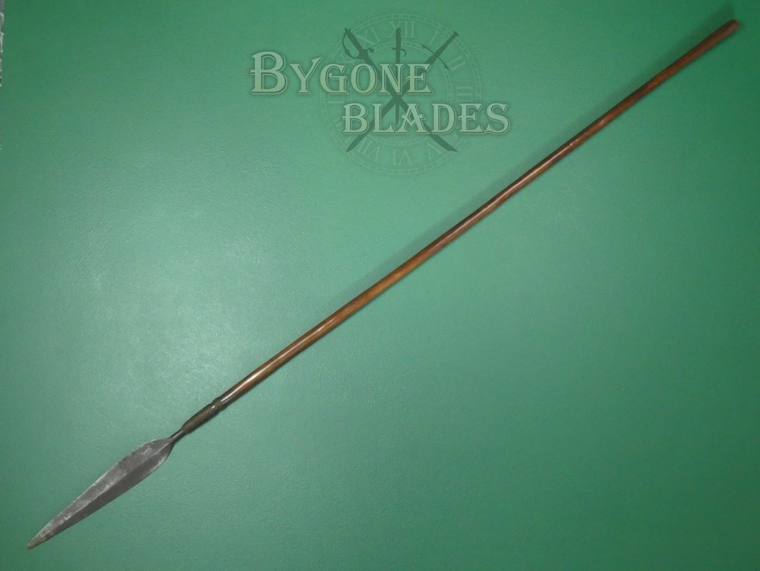 This is a great example of a Zulu Iklwa with a broad, leaf-shaped blade and moderate flare to the end of the haft. Many Zulu weapons, like this one, were collected by the British troops and brought back to the UK as souvenirs after the Anglo-Zulu War of 1879.