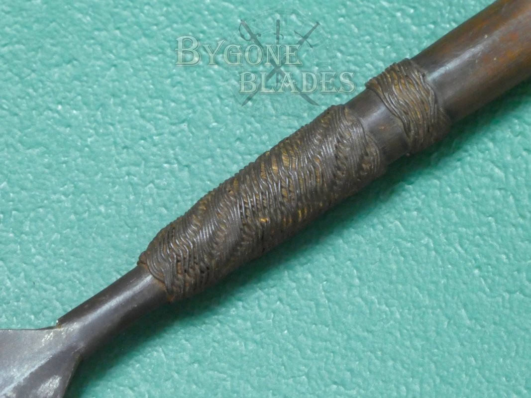 The blade is secured firmly within the haft with plant-based resin and woven wire was added to strengthen the bond. The wire is in very good condition. A second band of woven wire sits below the first. Decorative flourishes were used to distinguish the owners iklwa from others. The blade is firm in the haft.