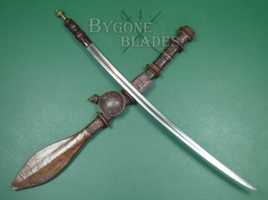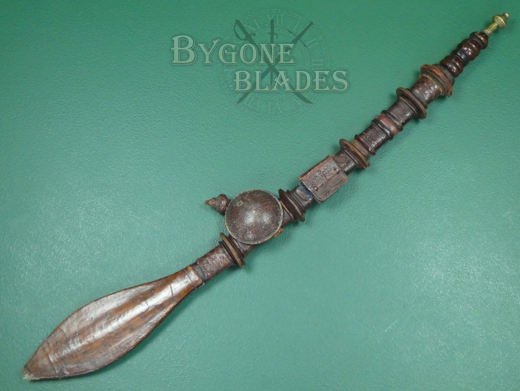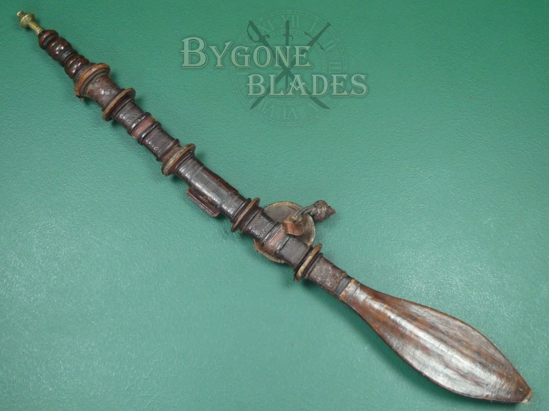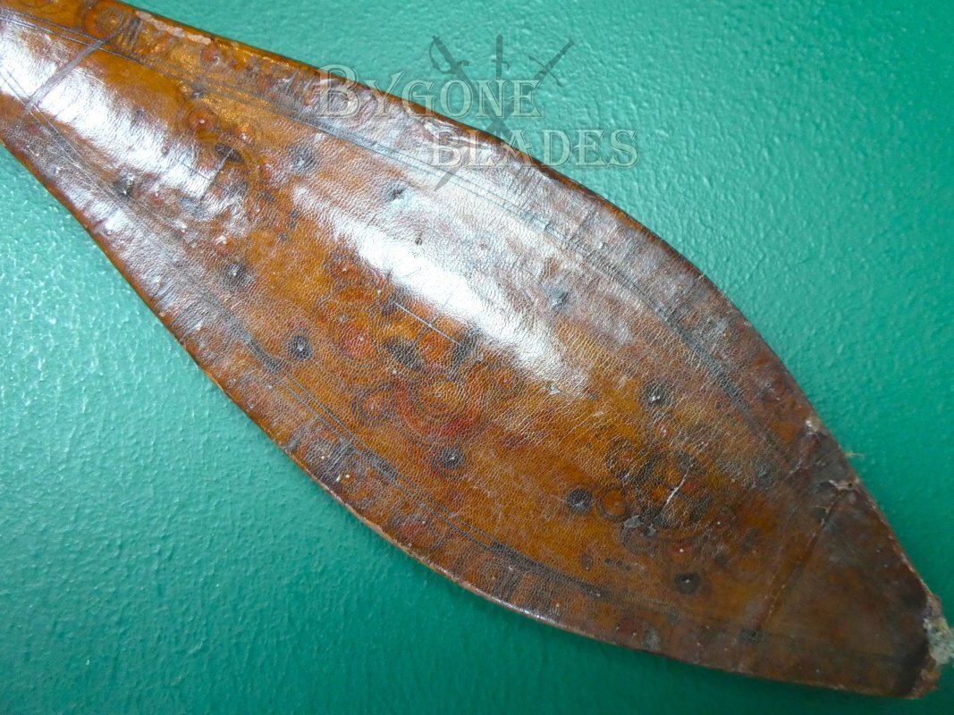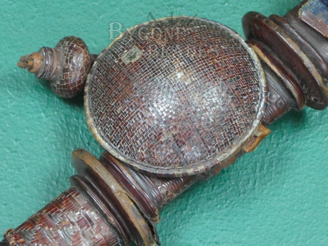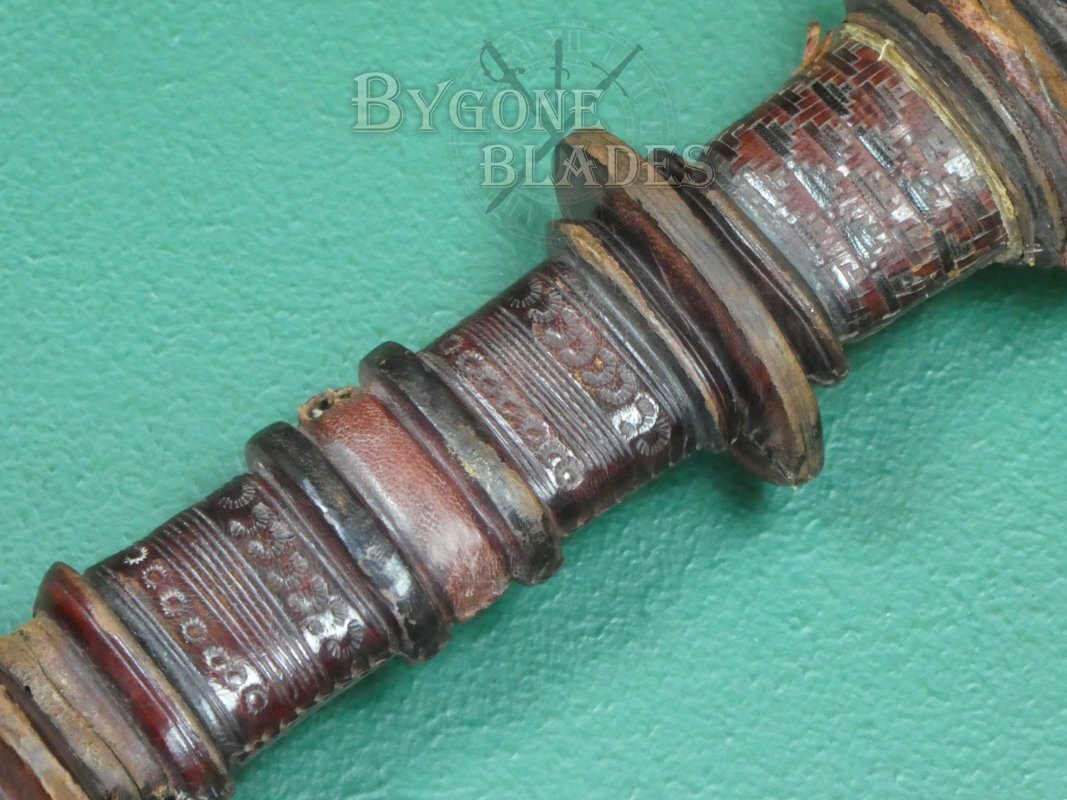 The sword is complete with its beautiful scabbard. The wooden scabbard is covered with leather and decorated with a shield-like rondel and woven and punched leather panels separated by leather disks. The paddle-shaped end of the scabbard is intricately and colourfully decorated. The scabbard is truly a work of art and is in overall good condition. The sword sheathes and draws smoothly and is held firmly within the scabbard.