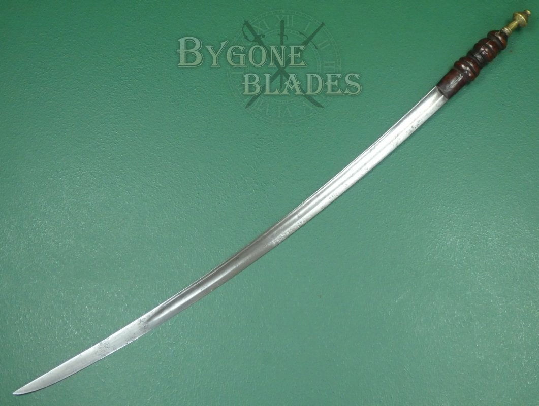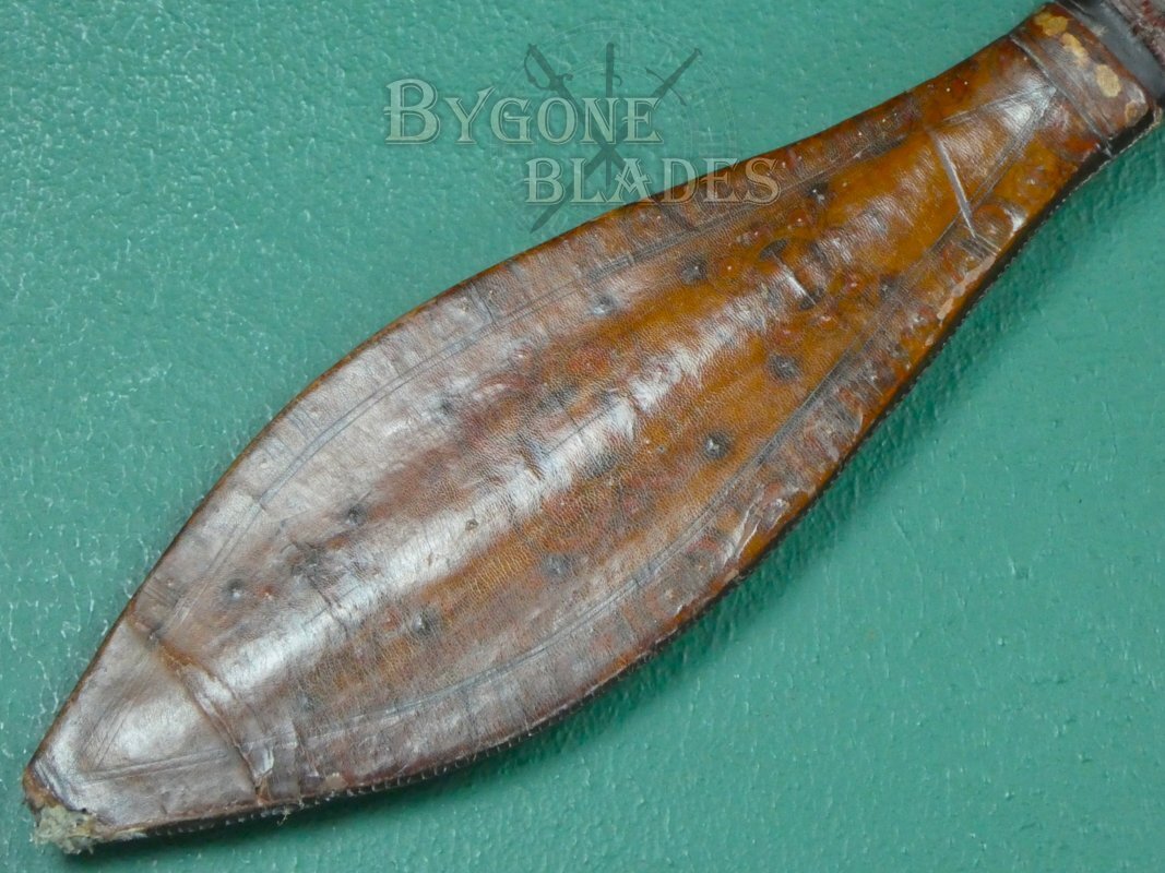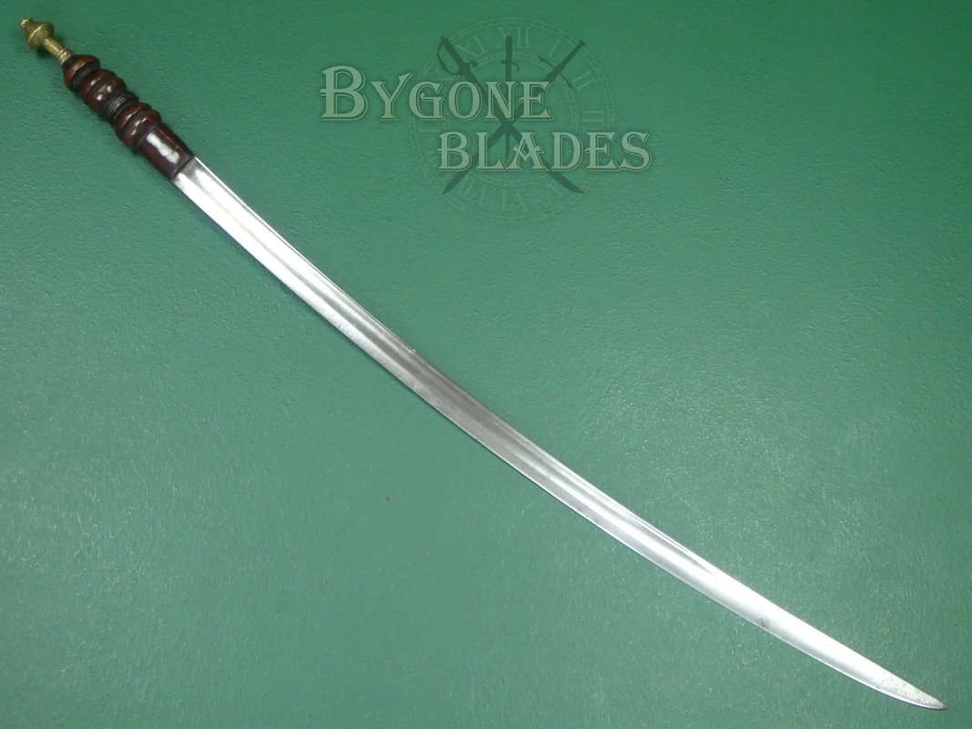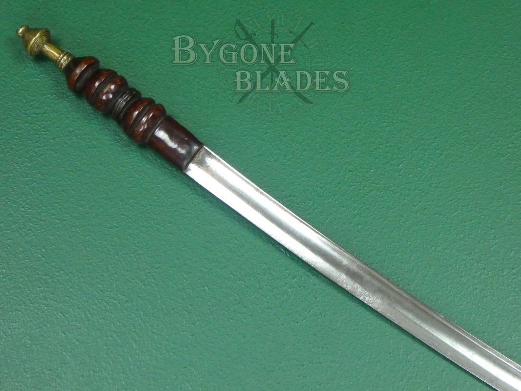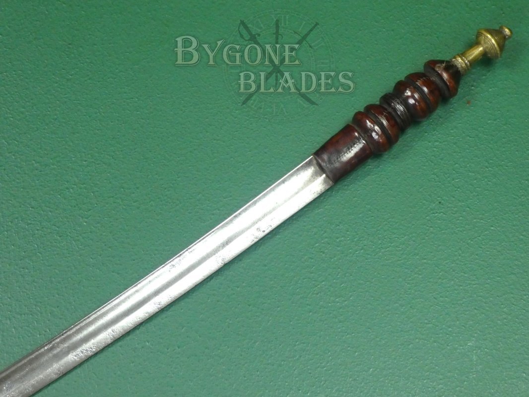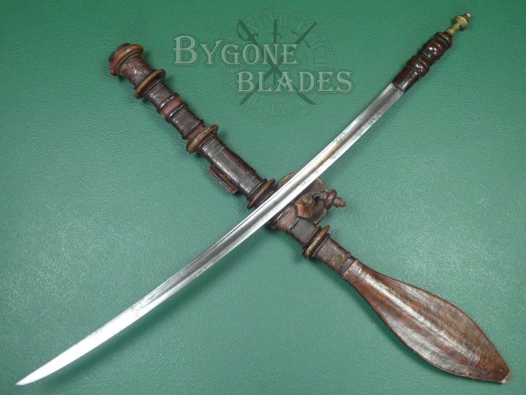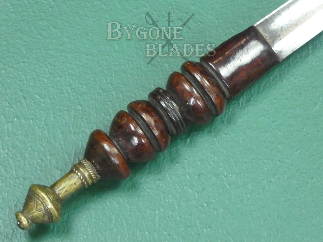 The sword is complete with its beautiful scabbard. The wooden scabbard is covered with leather and decorated with a shield-like rondel and woven and punched leather panels separated by leather disks. The paddle-shaped end of the scabbard is intricately and colourfully decorated. The scabbard is truly a work of art and is in overall good condition. The sword sheathes and draws smoothly and is held firmly within the scabbard.