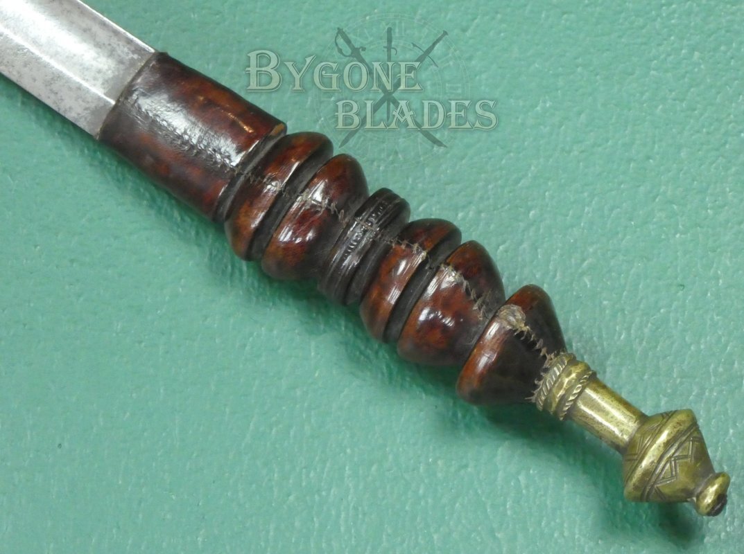 The Mandingo used wood with an ornate brass pommel piece to re-hilt the blade. The carved hardwood grip was then covered with leather and the tang of the blade, which passes through the brass pommel, was peened to secure the hilt. The blade is firm in the hilt and the stitching of the leather is intact and tight.