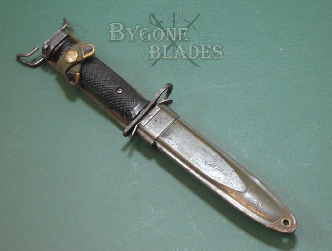 The bayonet is complete with its M8A1 scabbard with steel throat and integral webbing belt loop. The throat of the scabbard is stamped with, USM8A1 over PWH, showing that the scabbard was made at the Pennsylvania Working Home for the Blind. The PWH produced M8A1 scabbards from 1965 until 1969. The last contract being in January 1969.