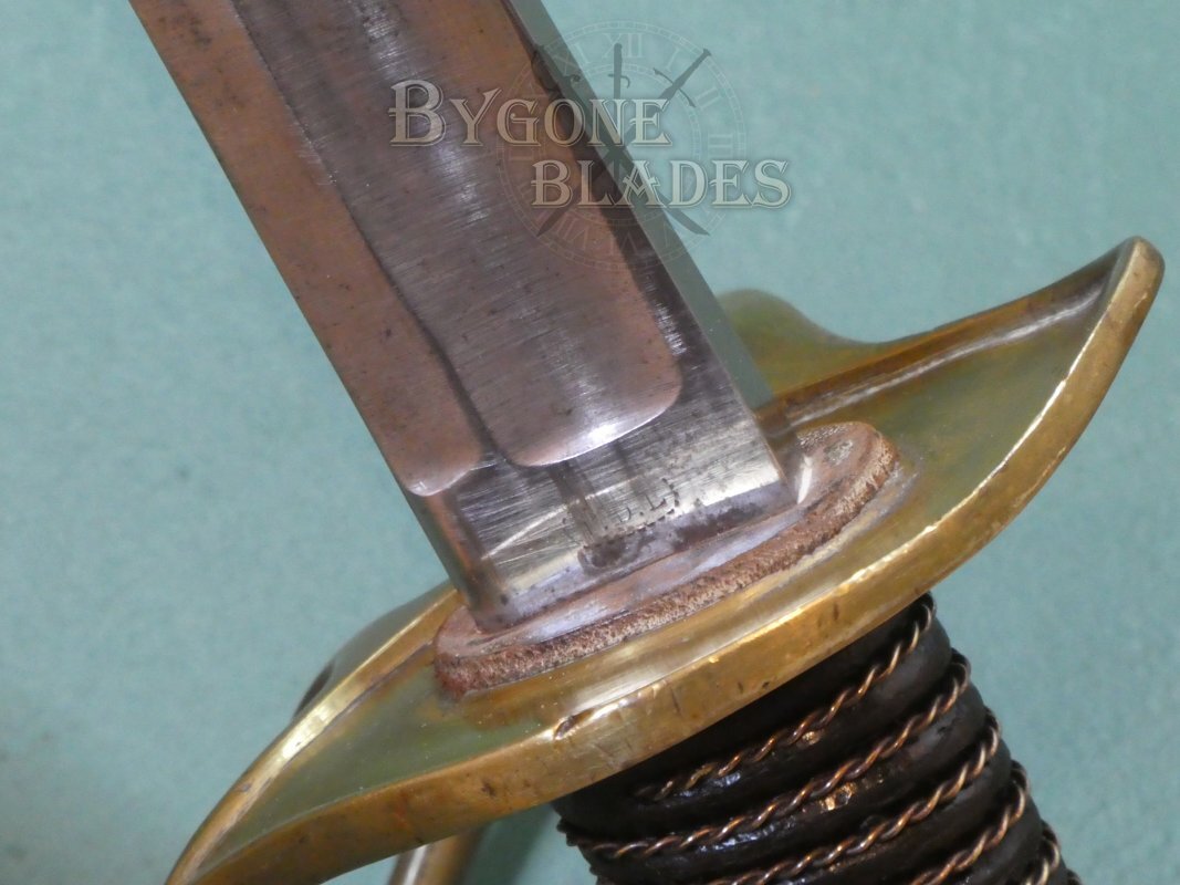The heavy, three-branch brass hilt is stamped on the D-guard with the number 79. The guard is in good condition and exhibits a beautiful and untouched age patina. The grip is in excellent condition for its age and use. The twisted wire is intact although it may be a well done replacement. The original leather is in good condition with some age and use related marks. The leather covers a wooden handle wrapped with cord for added grip. The peen is undisturbed.