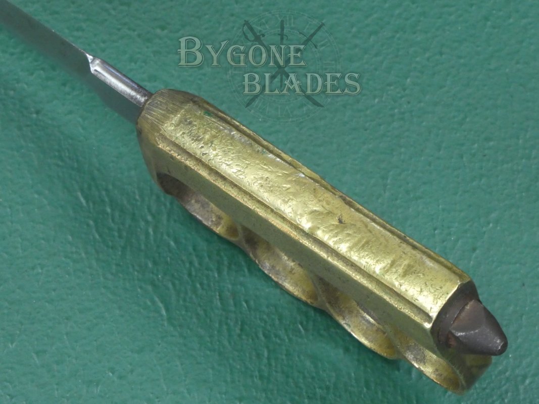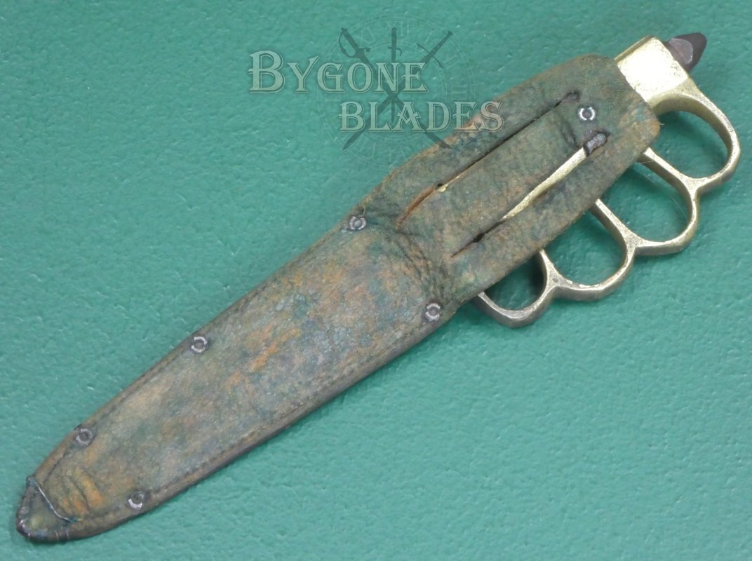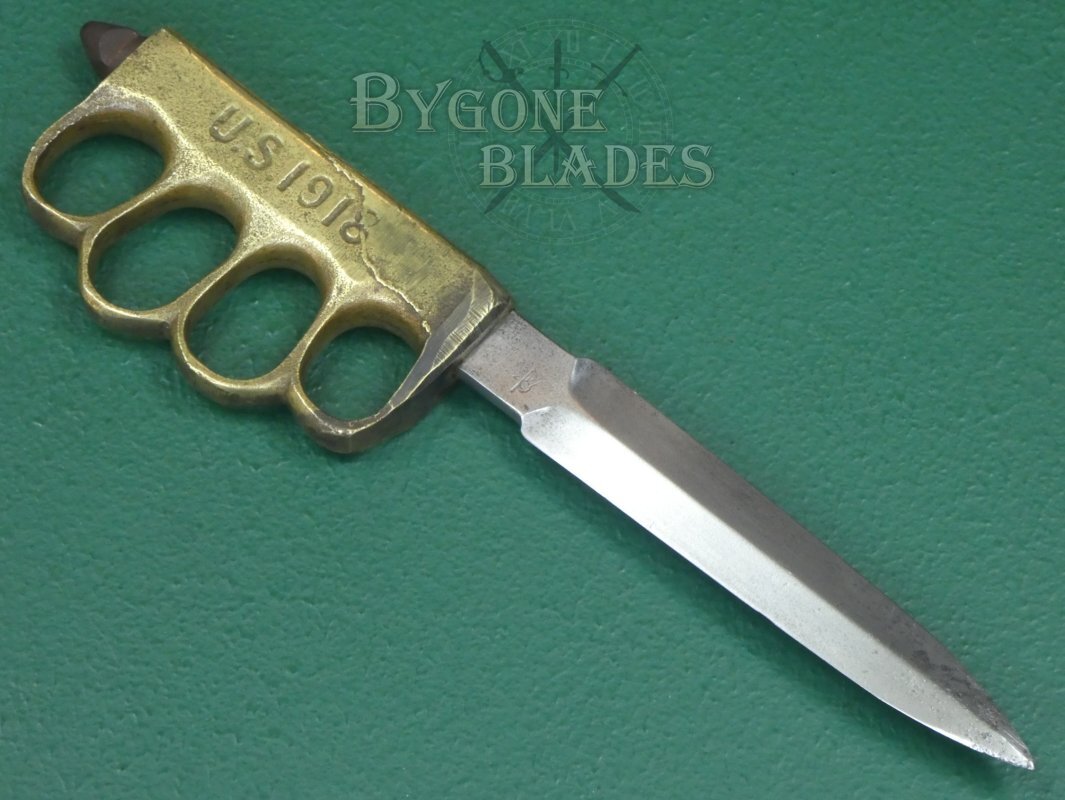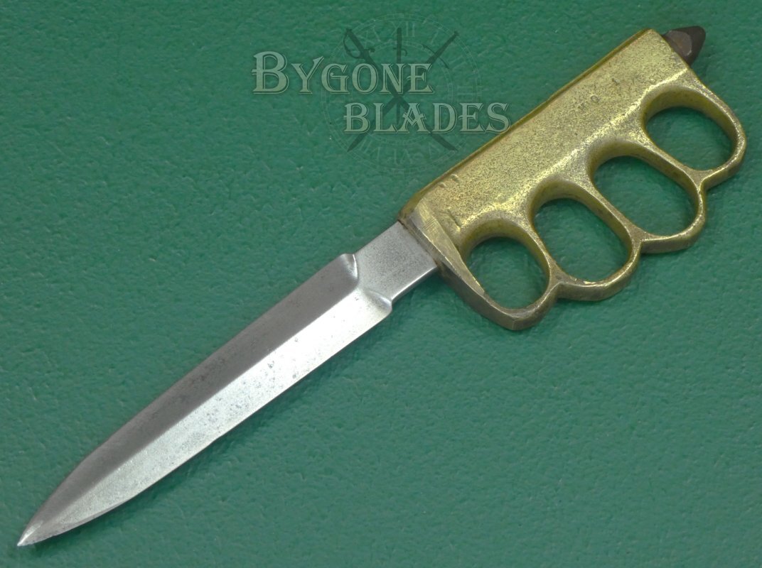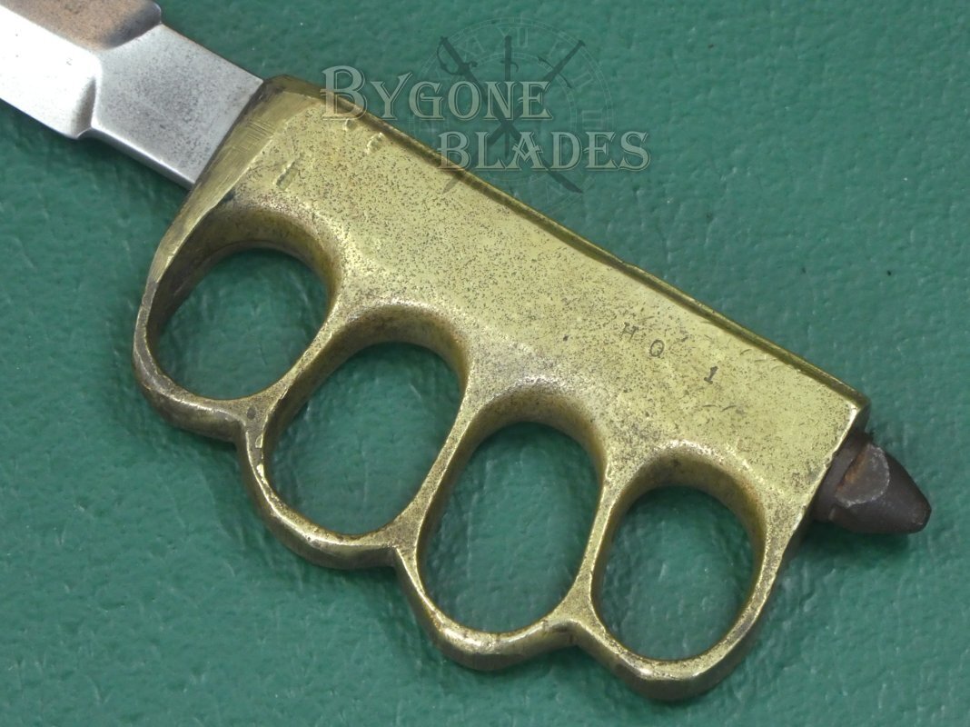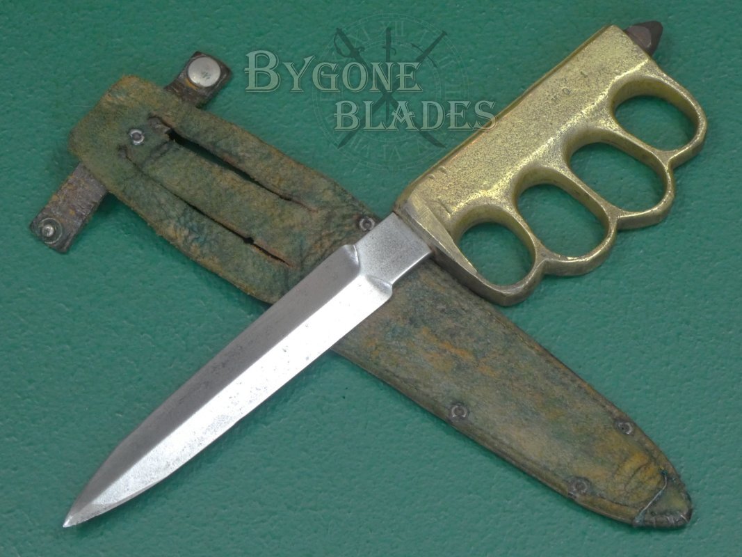 In December, 1941, when America joined WW2, American Government stores of the Mk I trench knife were issued to soldiers in the US Airborne regiments. These soldiers often ground off the front guard to allow the knife to be sheathed in a leather scabbard and worn snug to the body. Sometimes the spiked apexes to the knuckles were also ground off to prevent them from snagging on equipment and clothing. The removal of the guard and spikes in no way detracted from the devastating impact of the brass knuckles as a close-quarter-battle weapon.