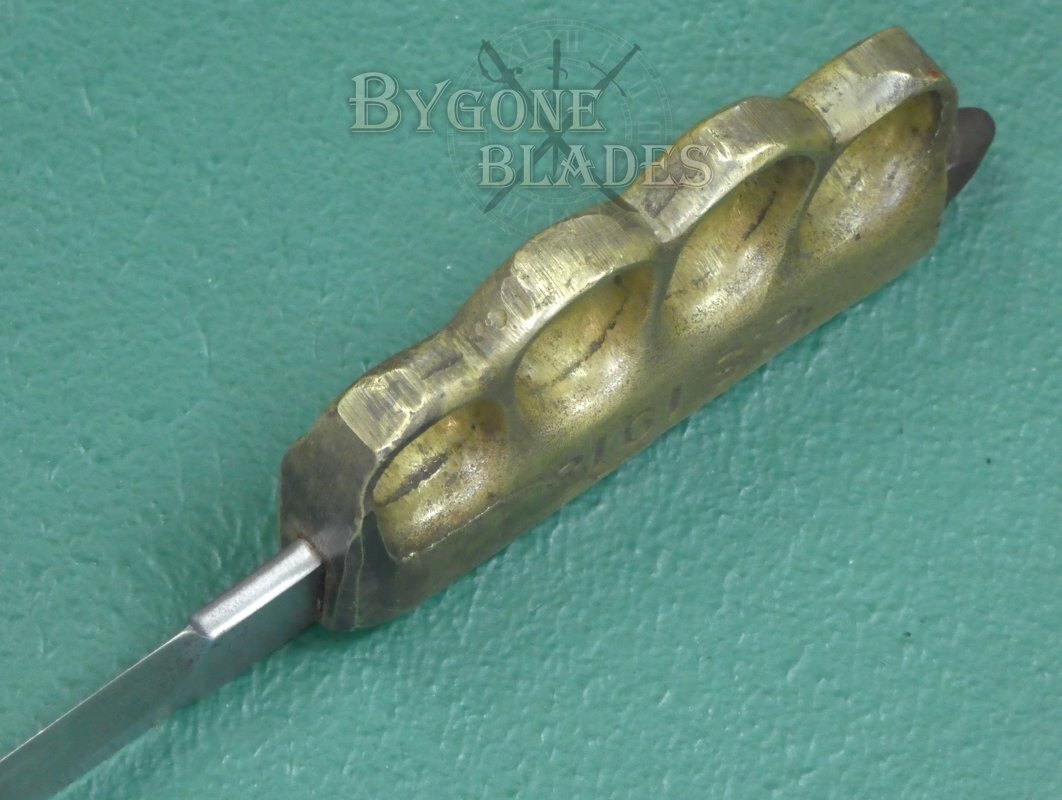 The roughly cast brass knuckle hilt has had the guard ground down, along with the spiked apexes to the knuckles. The pattern designation, U.S. 1918 is cast into the right-hand side of the grip. The letter & numeral combination, H Q 1 is stamped into the obverse of the grip. The hurriedly made French hilts are quite roughly cast compared to the American made examples.