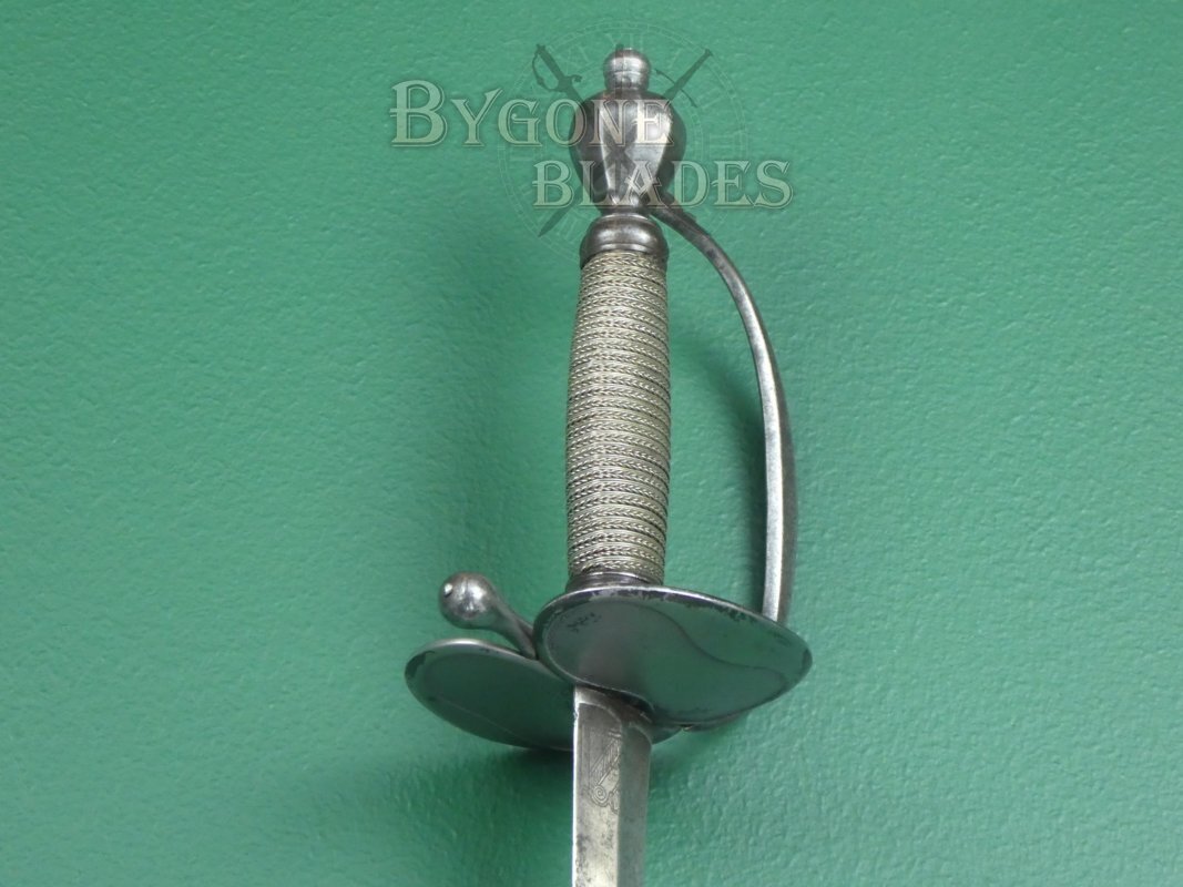 The steel hilt has a double kidney shaped, rigid shell guard and steel D-shaped knuckle bow that extends to a nippled, bud-like quillon. The shell guard retains almost all of its original plated finish. The wooden grip is wrapped with twisted silver wire. The wire wrap is intact and tight and in excellent condition. The hilt is finished with a faceted urn-shaped steel pommel through which the tang is peened. The hilt is in excellent condition and the blade is firm within it.