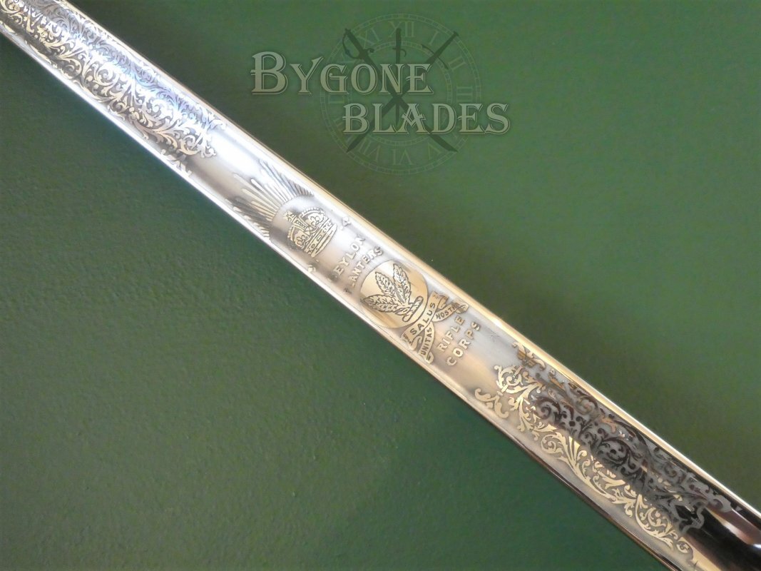 The blade is deeply and crisply etched with foliate scrollwork and King George V crowned royal cipher above the Rifle Brigade’s horn and ribbon. The obverse bears foliate scrollwork, a rayed crown and the badge and motto of the Ceylon Planters' Rifle Corps with their motto, Unitas Salus Nostra, (Safety in Unity). The ricasso is etched with the maker’s details, “Henry Wilkinson, Pall Mall. London” below the Royal Warrant.