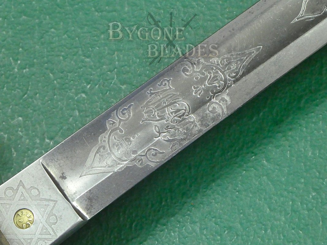 The obverse of the blade has Queen Victoria’s crowned royal cipher amidst foliate scrollwork panels. The ricasso is etched with the retailer’s details, Hobson & Sons, Little Windmill Street, London. The obverse ricasso bears a Pillin family proof stud.
