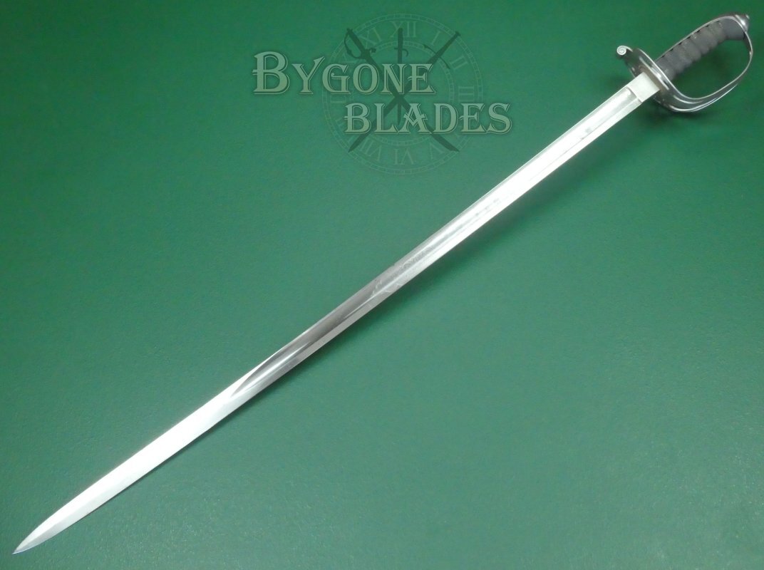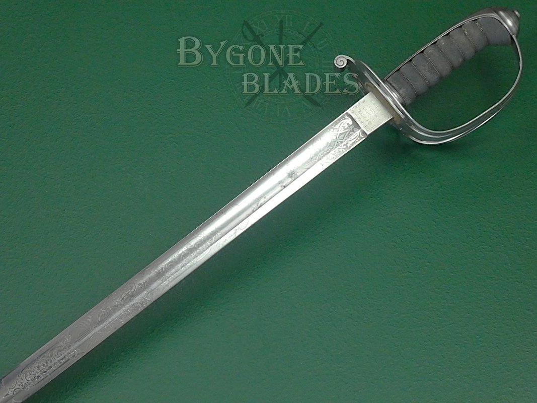 The 875mm single-edged blade is of the 1845 “Wilkinson” pattern. The blade has a flat spine above a broad single fuller and tapers to a double-edged spear point. The blade is in very good condition with minimal age and use related marks.