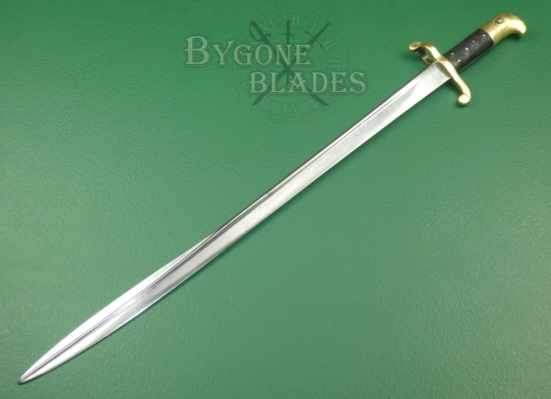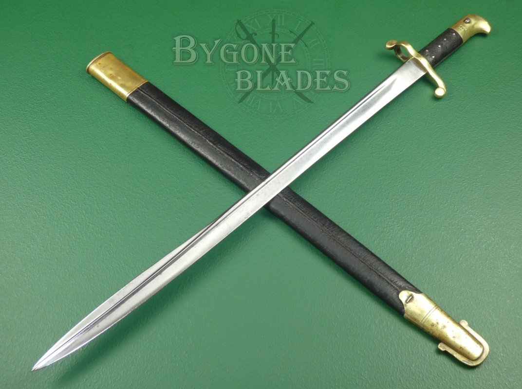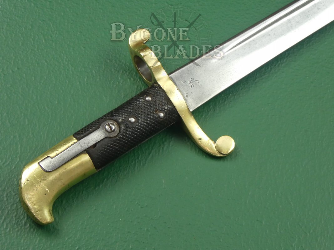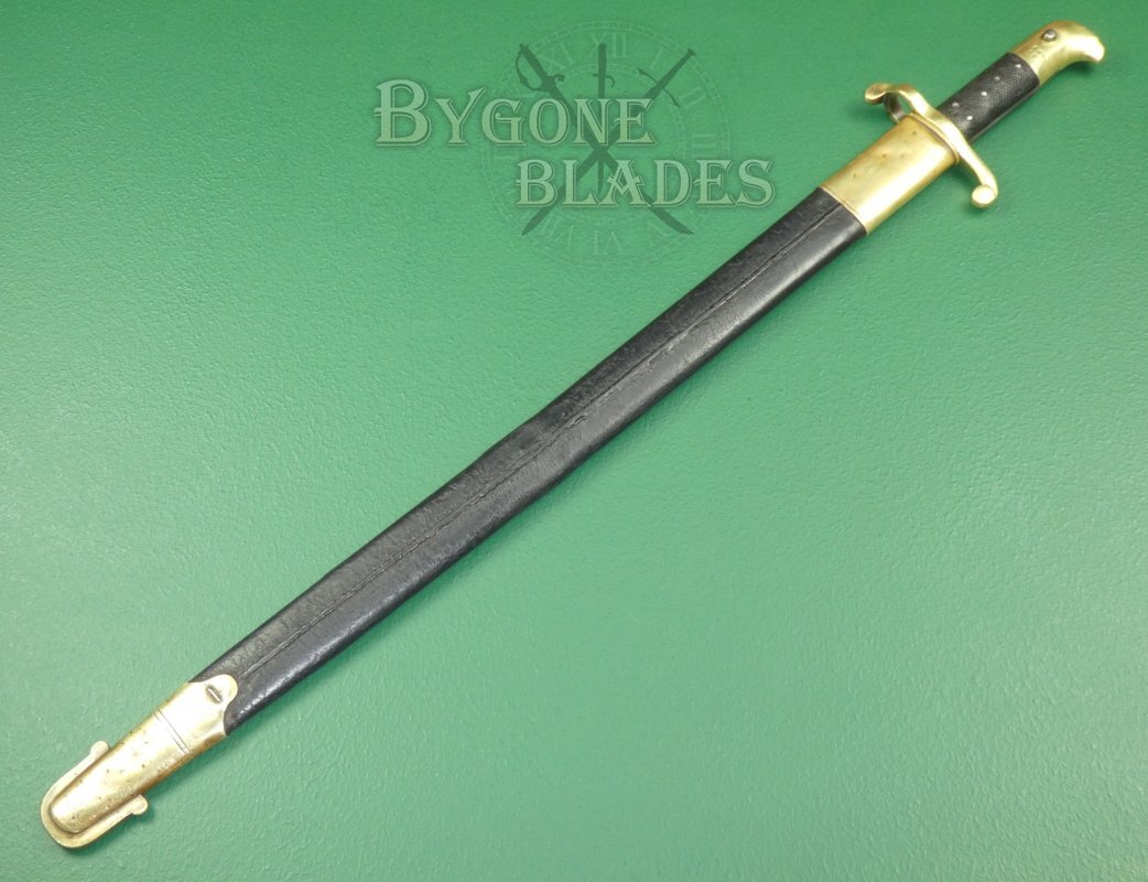 The bayonet is complete with its original brass mounted leather scabbard. The leather is in good condition with some crazing and marks to the original finish. The middle of the bayonet has had a good and strong repair to splits in the sides. The stitching is intact and tight. The brass furniture is in good condition with some small dings and age-related marks. The locket is missing its frog stud. The locket and chape are stamped with Birmingham inspection marks. The bayonet sheathes and draws smoothly and is held firmly within the scabbard.