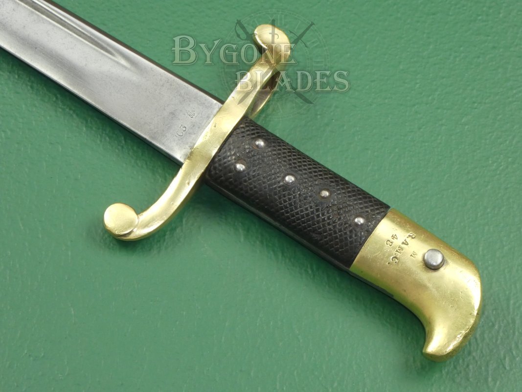 The iconic brass cross guard and bird-beak pommel are in good condition. The beaked pommel bears the unit markings of the Royal Army Medical Corps and issue number 48. Most P1855 Lancaster carbine bayonets were re-issued to the medical corps as side arms after the Engineers adopted a new pattern rifle and bayonet. The press-stud and external spring catch are in good working order. The chequered leather grip scales are in good condition. The spine of the tang is stamped with the partial makers’ name, “Elkington” and a Birmingham repair stamp.