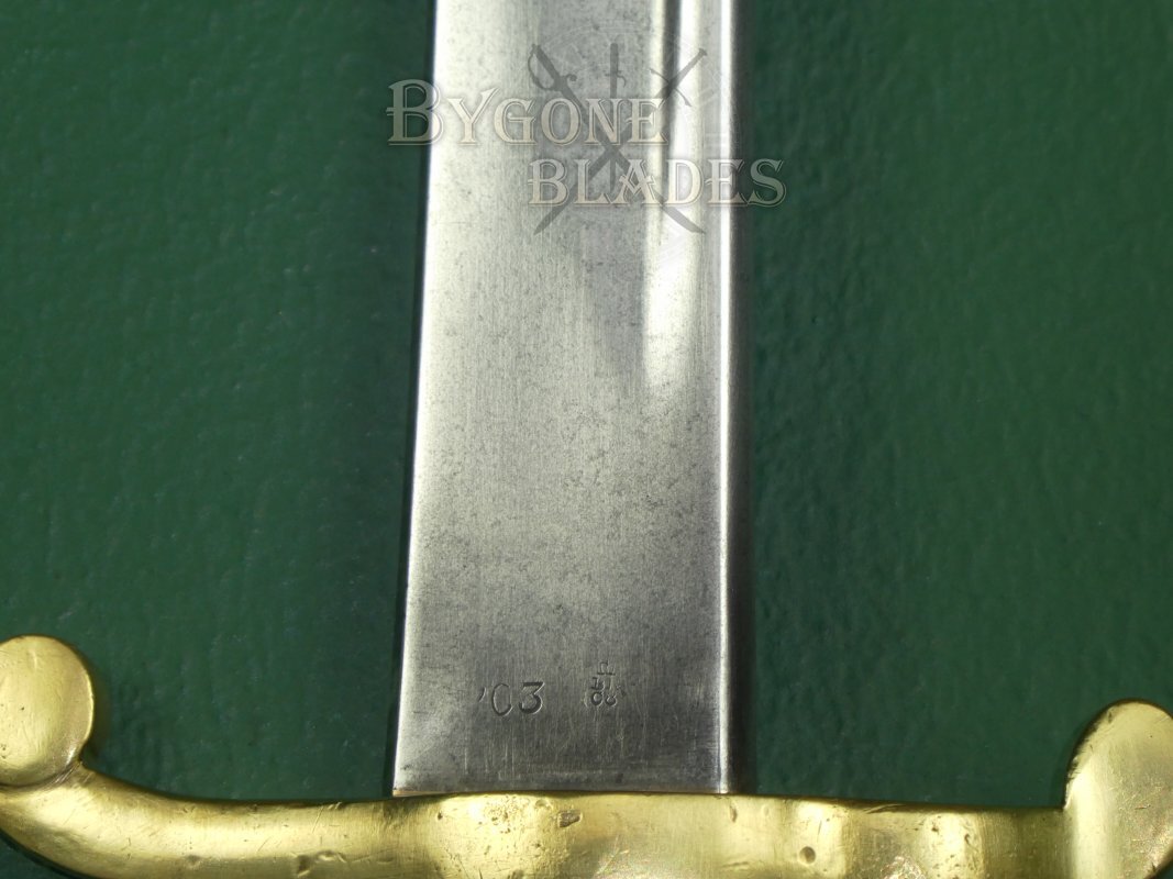 The 600mm pipe back blade is bright and clean with minimal pale speckles of tarnish. The ricasso bears the War department arrow, the production date ‘79 (1879), a bend test X, remnants of the Elkington makers’ details and an Enfield inspection stamp. The obverse ricasso bears the reissue date of ’03 (1903) and a Birmingham repair stamp. The belly of the ricasso is stamped with the number 77 below an inspection mark.