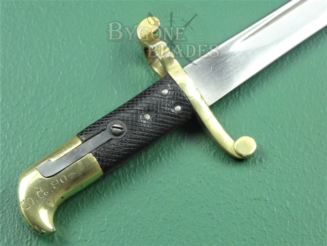The end of the beaked pommel bears the issue number 11 and 23D5. The side of the pommel is marked to the 10th Company of the 80th (Staffordshire Volunteers) Regiment of Foot. The press-stud and external spring catch are in working order. The presence of a screw retaining the leaf spring indicates that the bayonet was produced after 1858. Prior to 1858 the spring was fixed in place with a rivet. The chequered leather grip scales are in good condition.