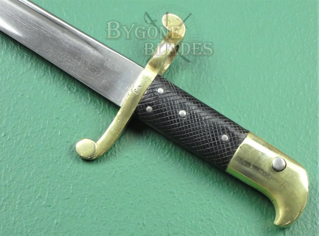 The P1855 is a very distinctive bayonet with a pipe backed blade and quill point. Possibly one of the best looking bayonets produced for the British army. The popular and growing volunteer movement within the UK during the 1850’s resulted in a commercial model of the Lancaster bayonet being produced for the Volunteer and colonial markets. This bayonet is one such example and is identical to the service pattern but without the government ownership and inspection marks.