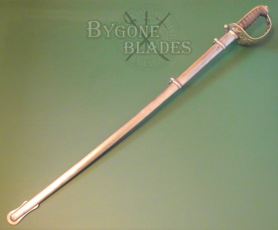 The sword is complete with its original steel scabbard with two suspension rings. The scabbard is in great condition with a mild age patina. There is a small, shallow dent on one side below the first suspension ring band. The sword sheathes and draws smoothly and is held firmly within the scabbard.
