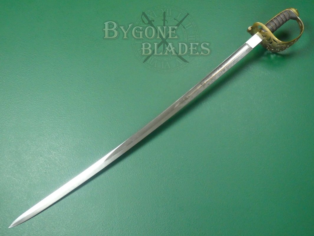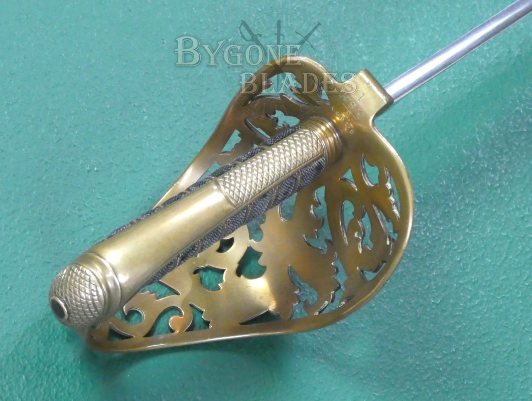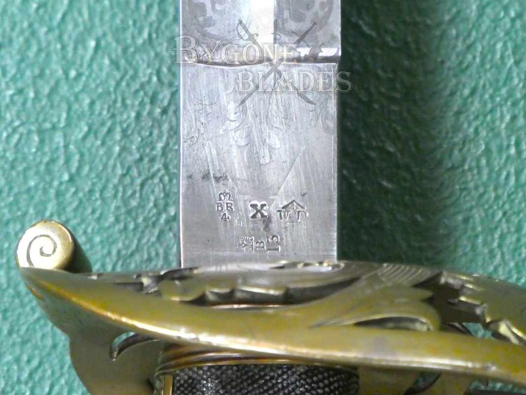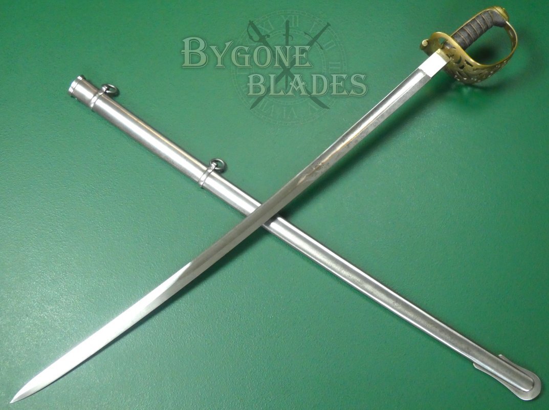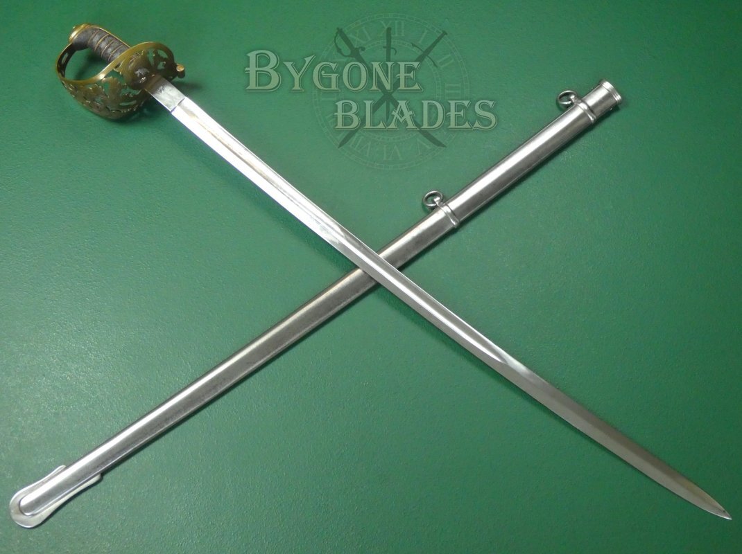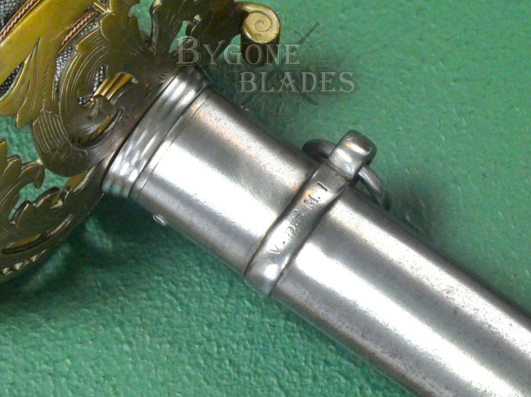 The shoe of the scabbard bears a Birmingham inspection stamp and the obverse bears a Birmingham refurbishment stamp. The scabbard is without dents or damage and has a great patina. The sword sheathes and draws smoothly and is held firmly within the scabbard.