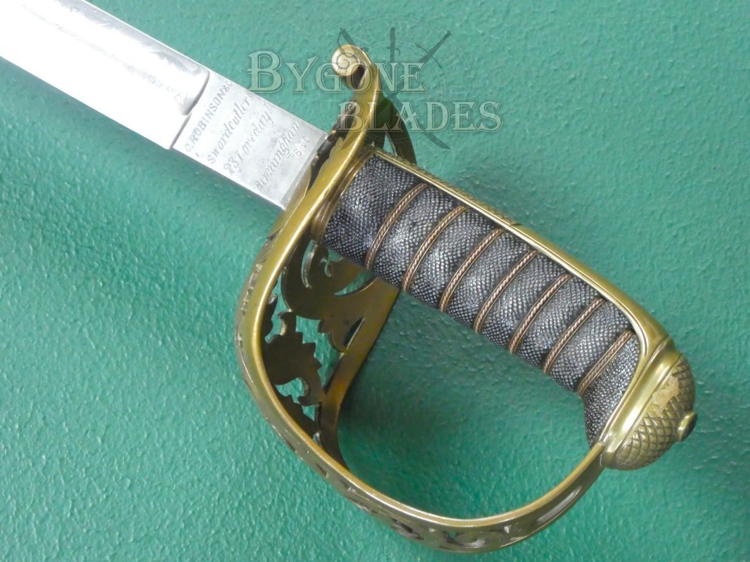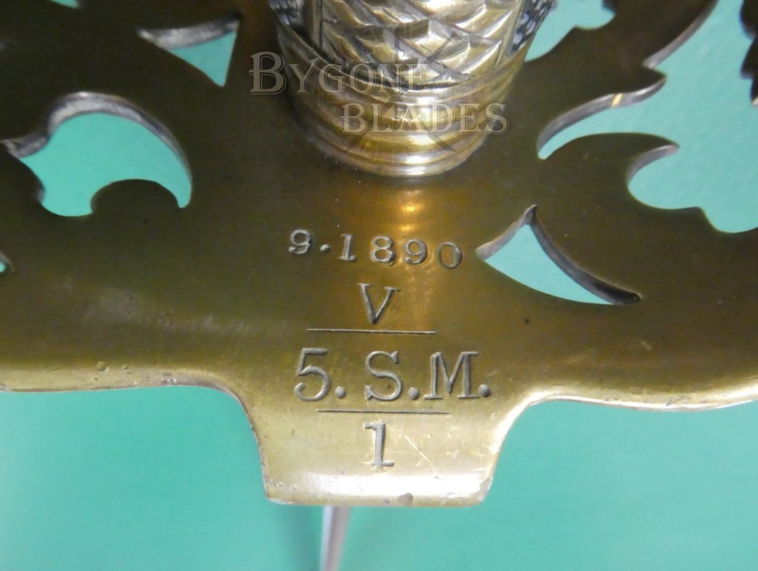 The sword is complete with its original, maker marked and unit designated steel scabbard. The top of the scabbard is engraved with the maker’s details, “Ge Robinson & Co. Birmingham.” The top ring band bears the designation V. 5. S. M. 1. and the obverse bears the production date, 8. 1890.