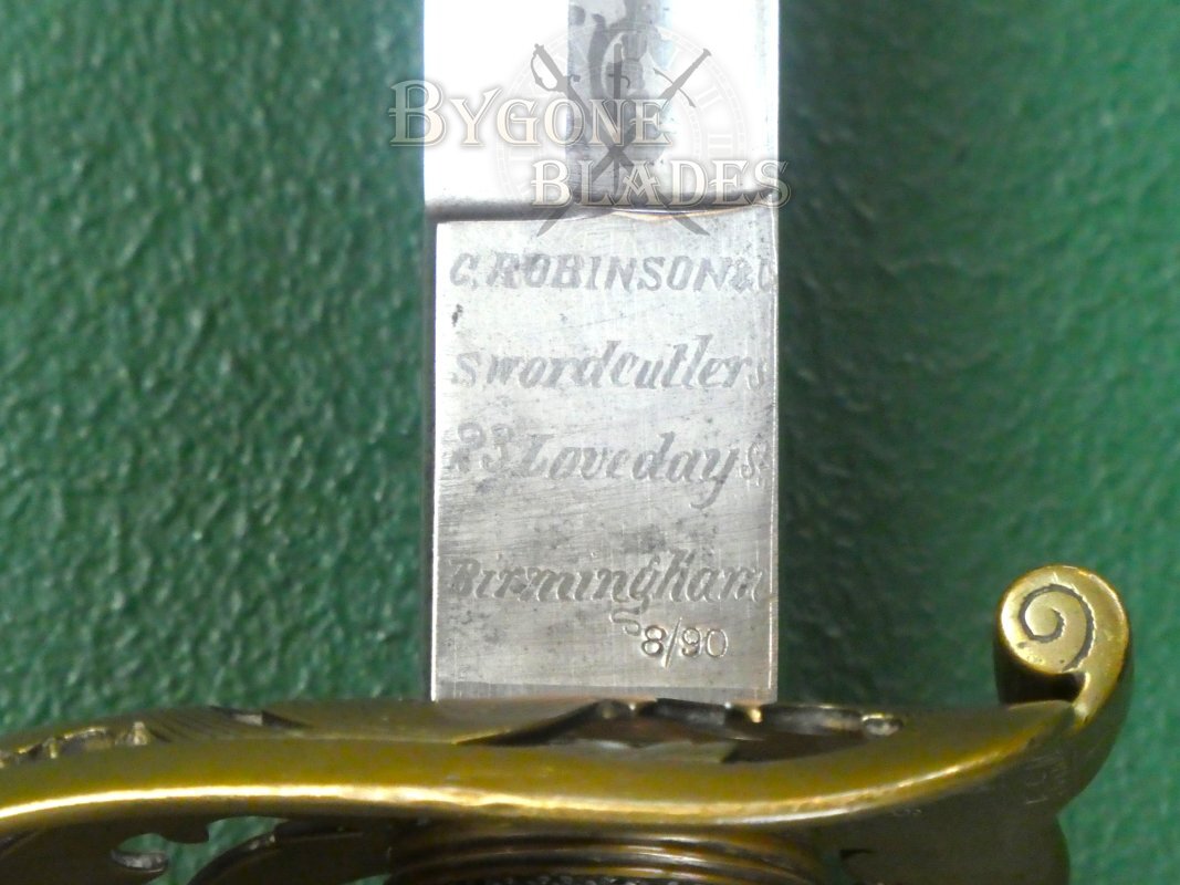 This excellent sword was made in August 1890 by George Robinson & Co. of Birmingham, England.