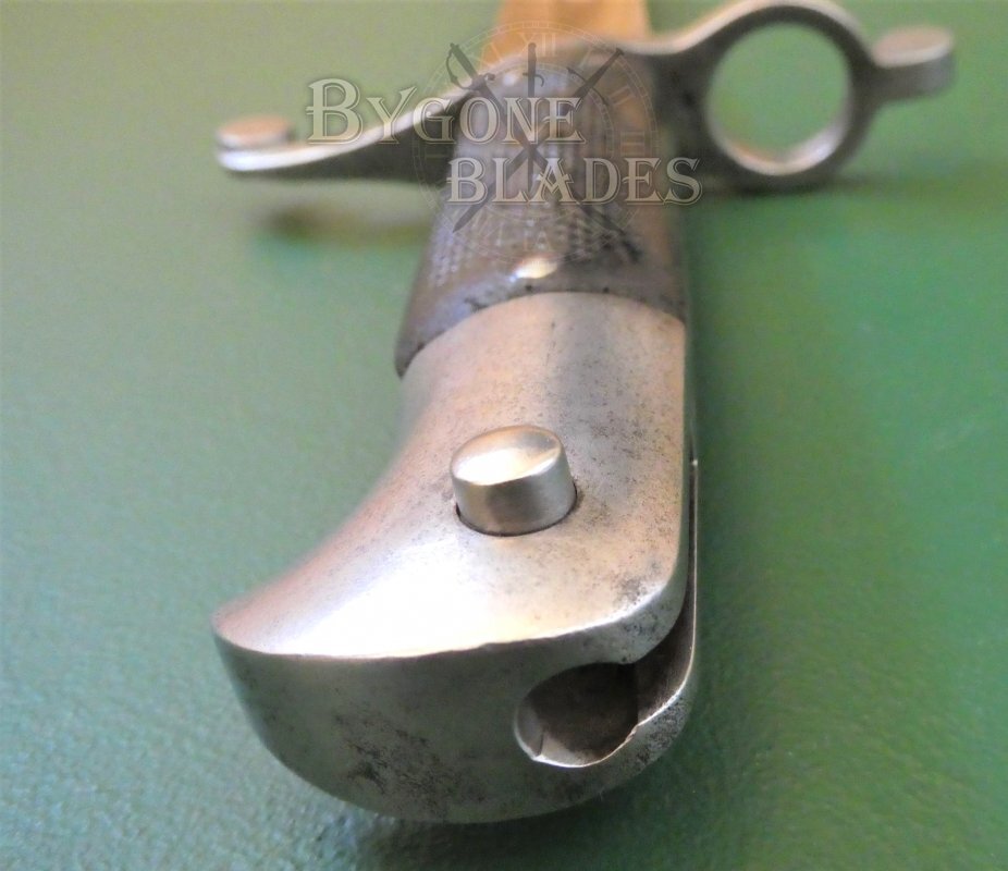 The steel hilt and crosspiece are in very good condition, the crosspiece, terminating in a disk finial opposite the coxcomb muzzle ring, is stamped with the number 837. The beaked steel pommel bears an Enfield inspection stamp at the top of the mortice slot. The press-stud and leaf spring are in good working order. The leather grip scales are in good condition and each scale bears a worn Enfield inspection mark.
