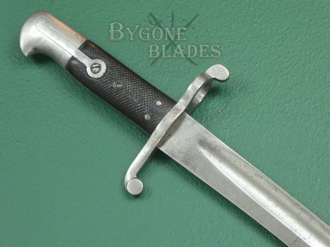 The bayonet is complete with its original issue scabbard. The leather scabbard with steel furniture is in very good condition. The frog stud is stamped with the number 16.