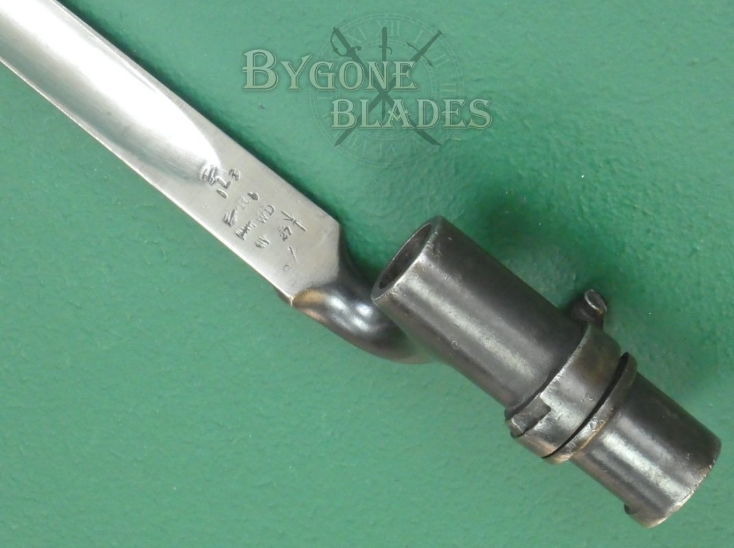 The 542mm tri-form blade is in excellent condition, retaining its original polish. The base of the blade is stamped with the War Department “WD” stamp, Broad Arrow and Enfield factory inspection stamp above a worn production date. An inverted Broad Arrows stamp indicates that the bayonet was sold out of military service. The additional stamps are Egyptian.