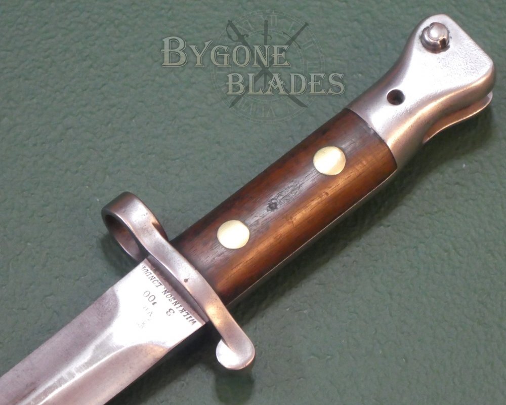 This desirable bayonet is in excellent condition for its 121 years of age and is highly collectable. The 305mm double-edged blade is marked on the ricasso with a flat crown above VR (Victoria Regina) and the production date, 3 ‘00 (March, 1900) over the manufacturer’s details; Wilkinson. London.