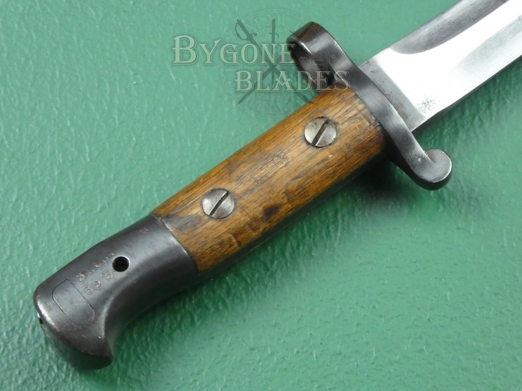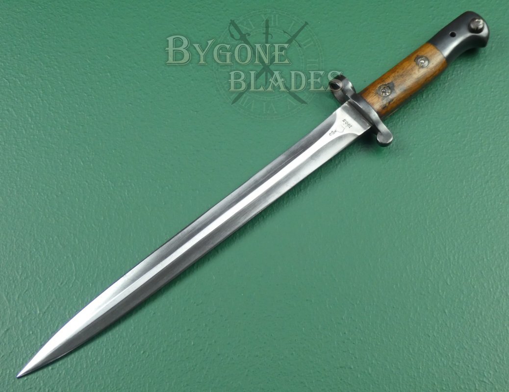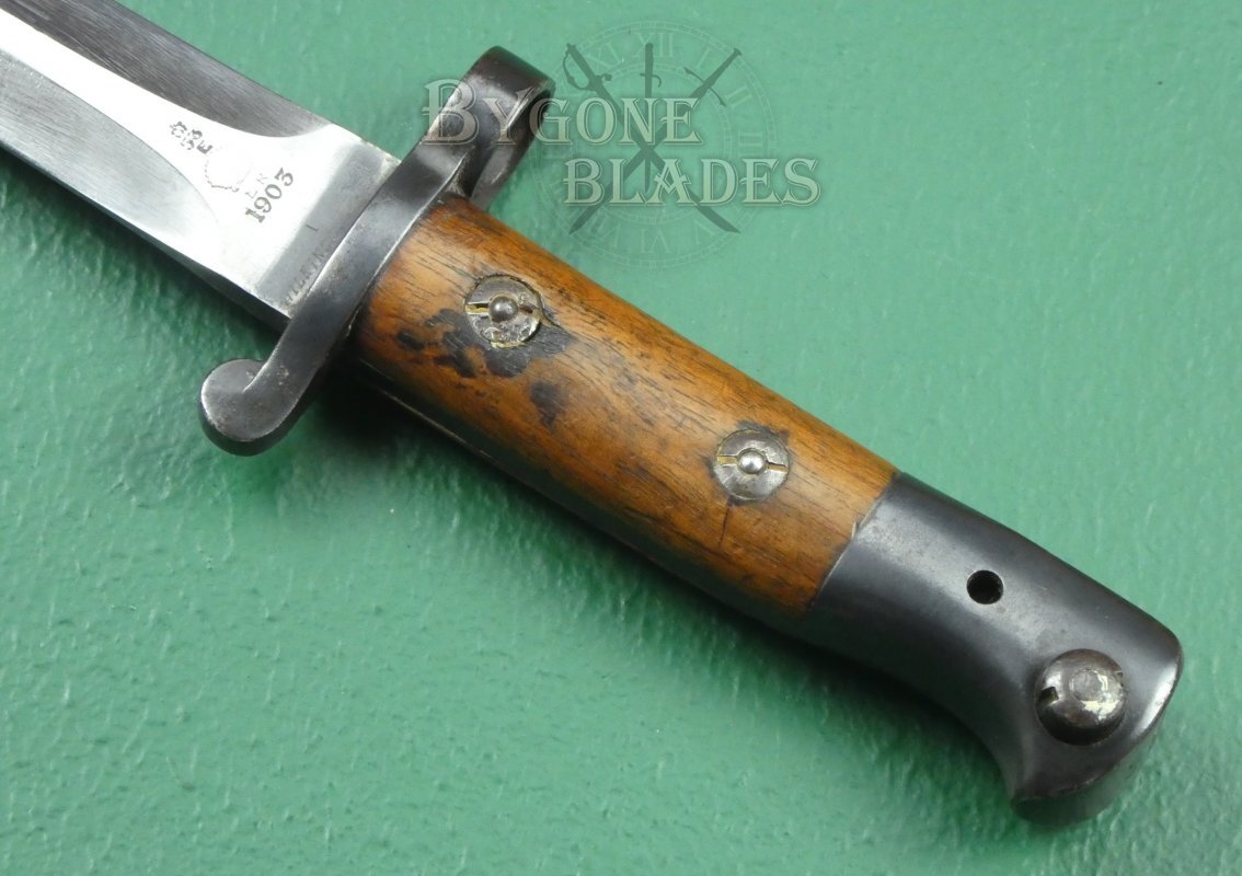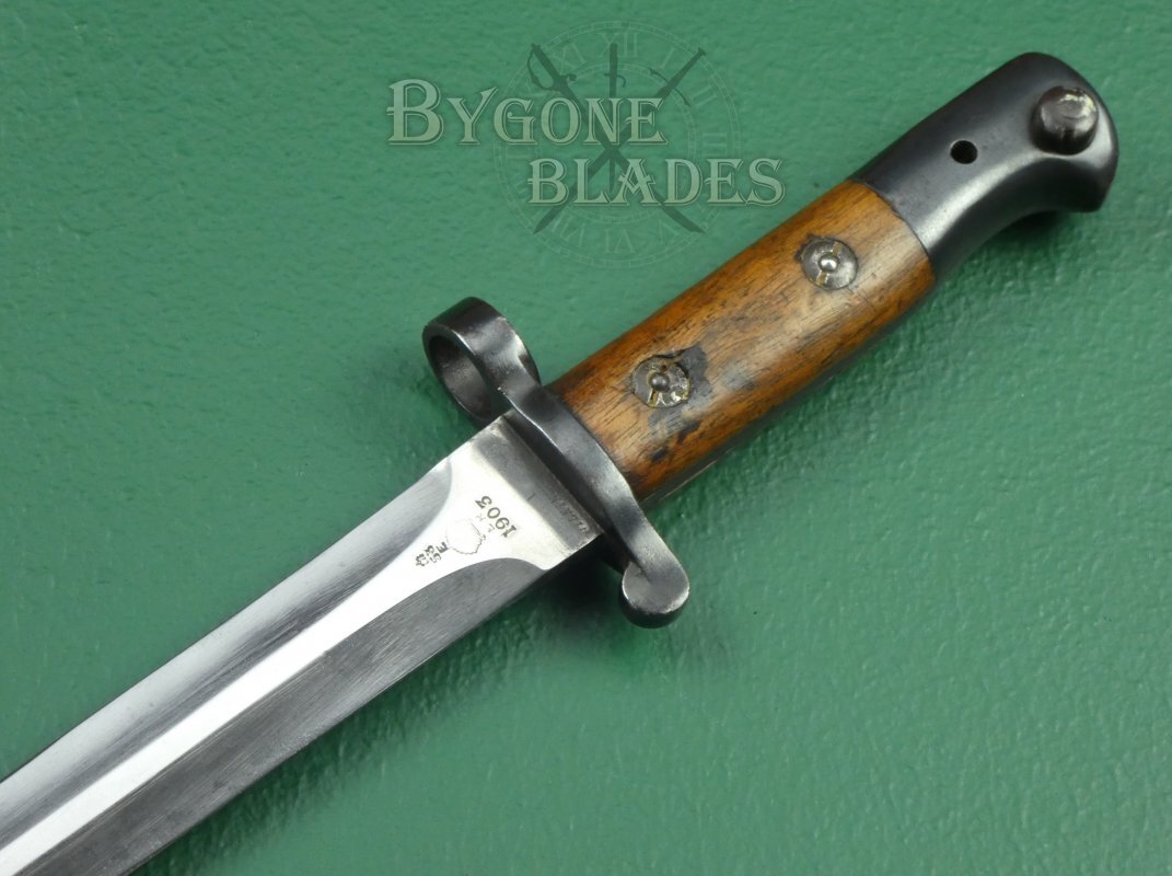 The P1903 had a short service life as the blade wasn’t thought to be long enough, having less reach than most European bayonets when combined with the shorter Mk1 rifle. The P1903 was produced for British use from 1903–1907, at which time the P1907 was adopted.