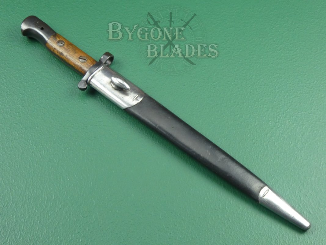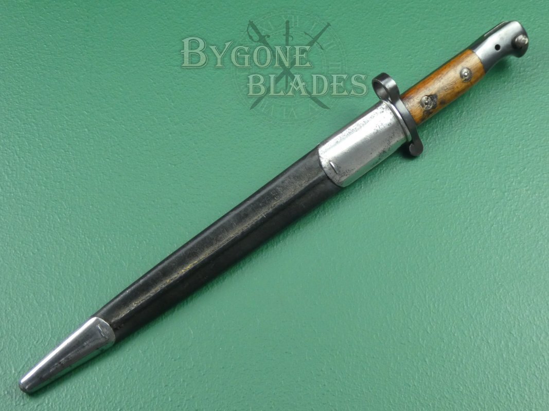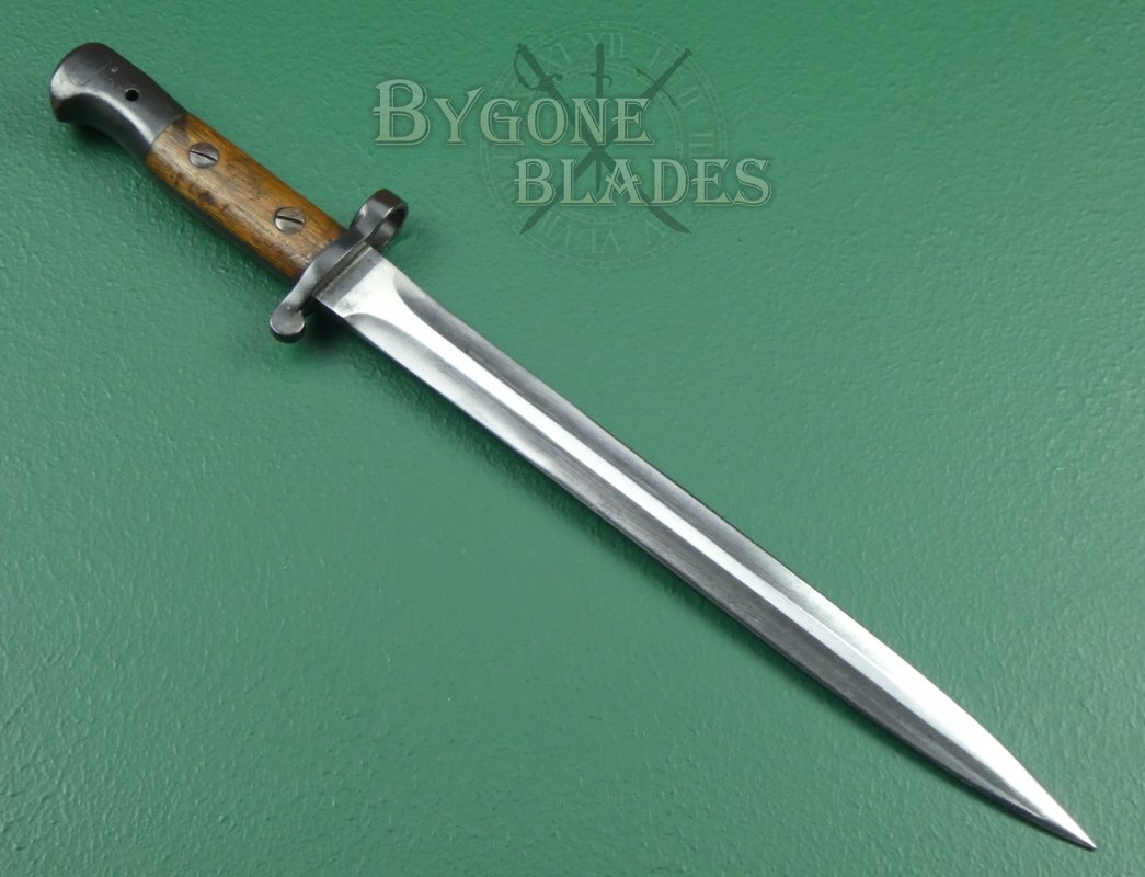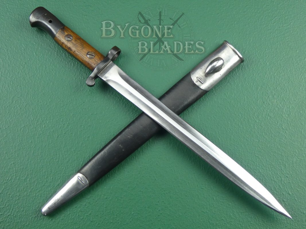 The P1903 had a short service life as the blade wasn’t thought to be long enough, having less reach than most European bayonets when combined with the shorter Mk1 rifle. The P1903 was produced for British use from 1903–1907, at which time the P1907 was adopted.