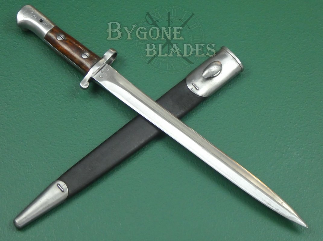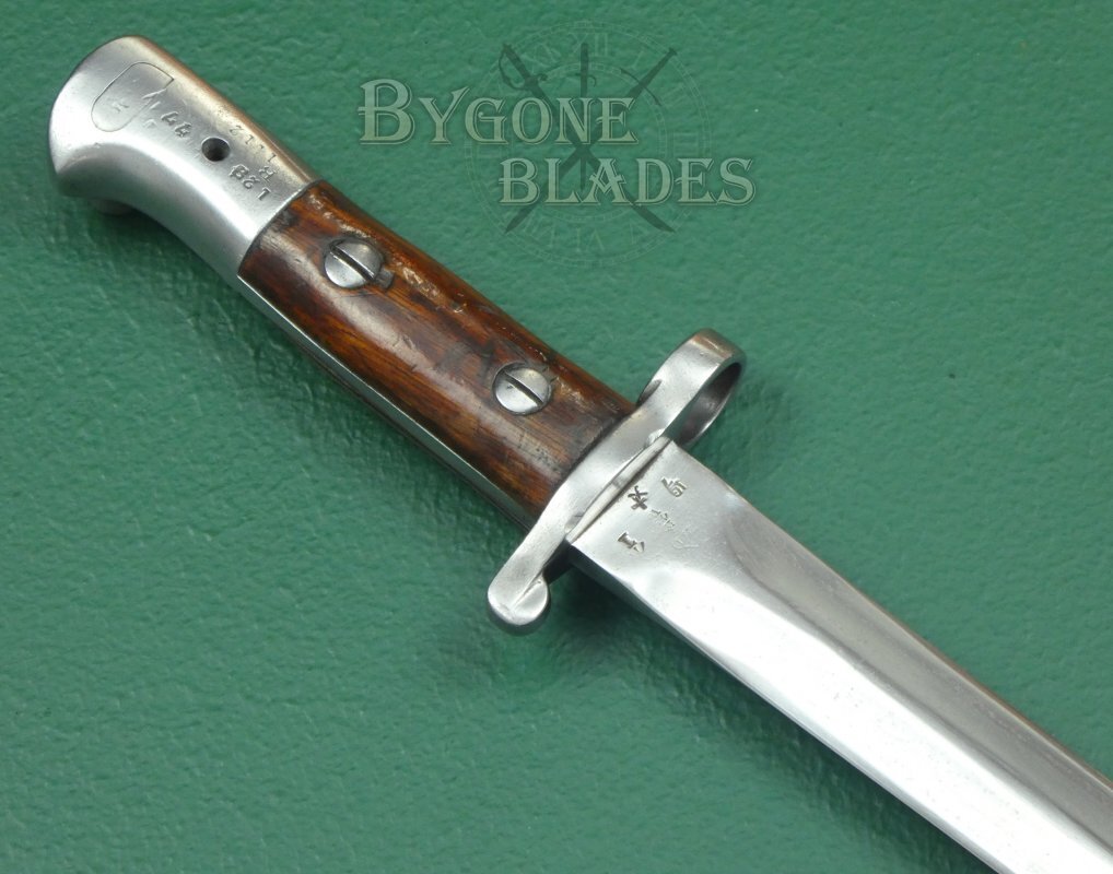 The P1903 design combined the P1888 blade and crosspiece with a new pommel design. Many 1903 pattern bayonets are actually P1888 bayonets that have been converted. This bayonet is a good example of a converted 1888.