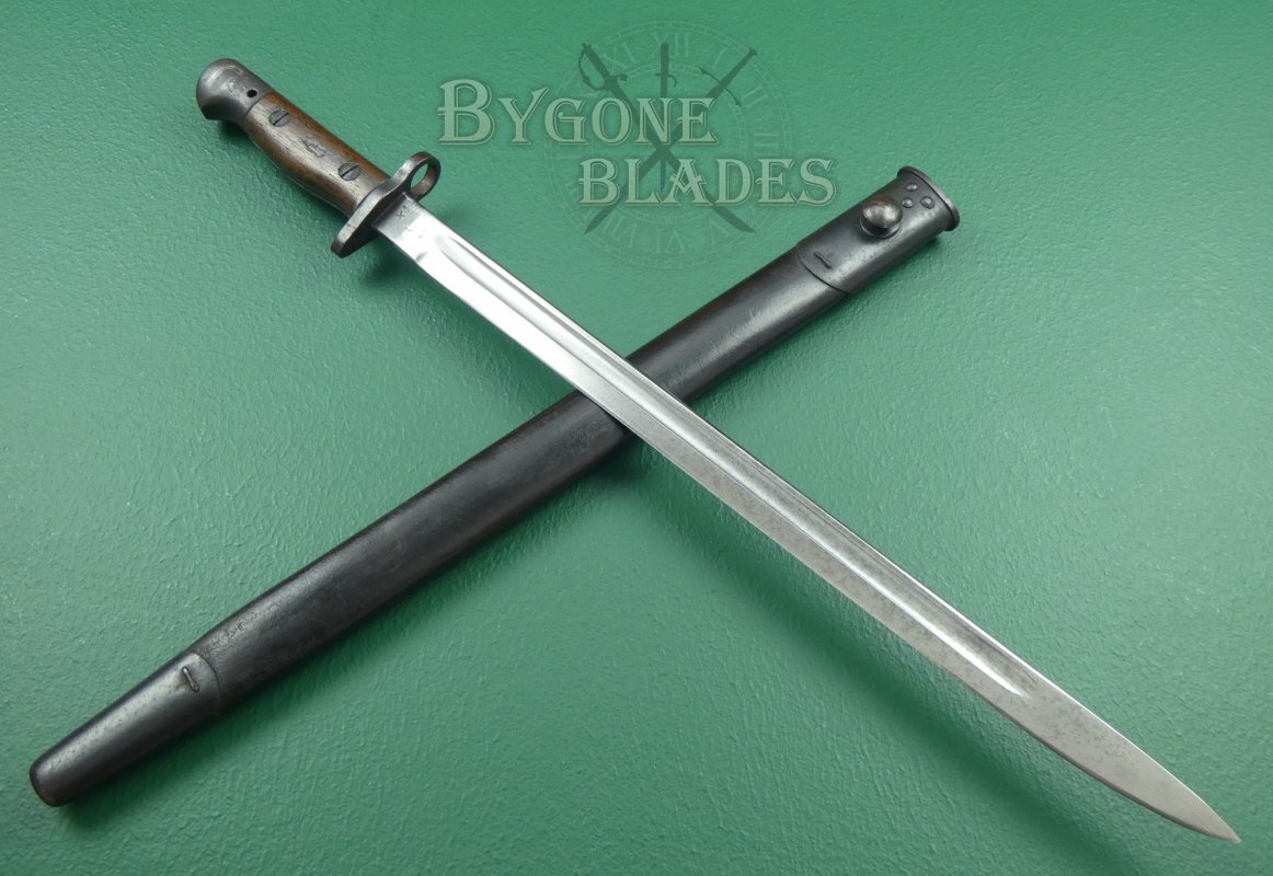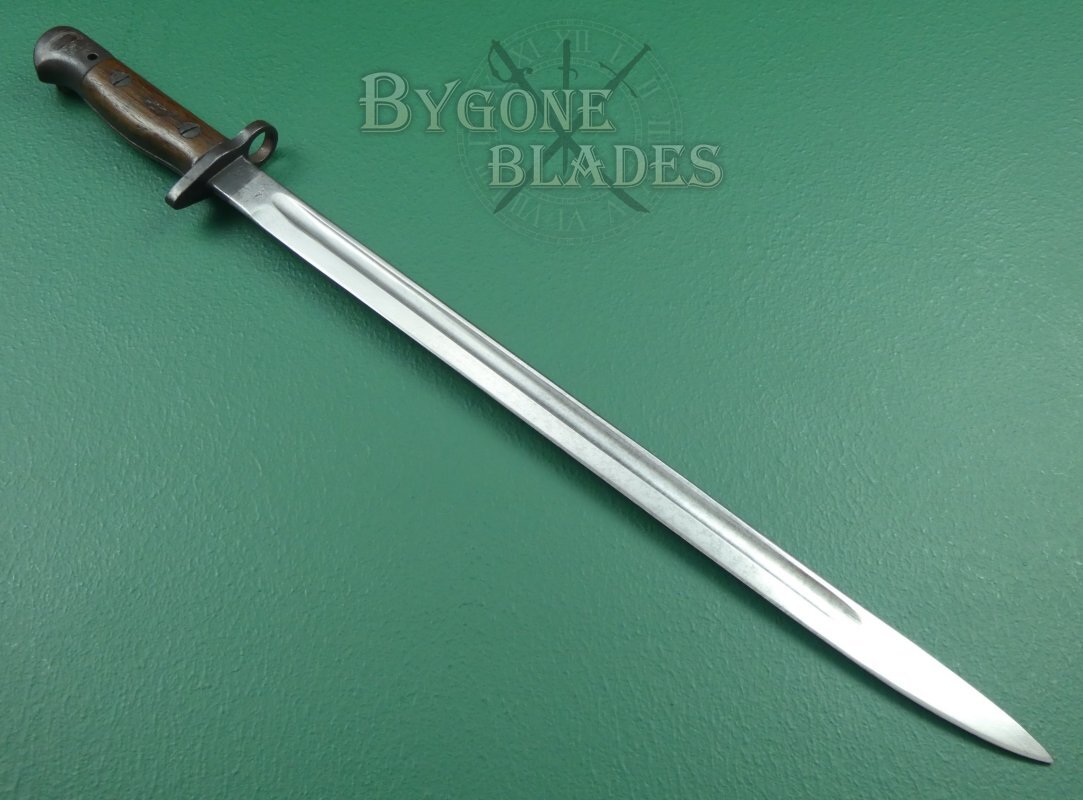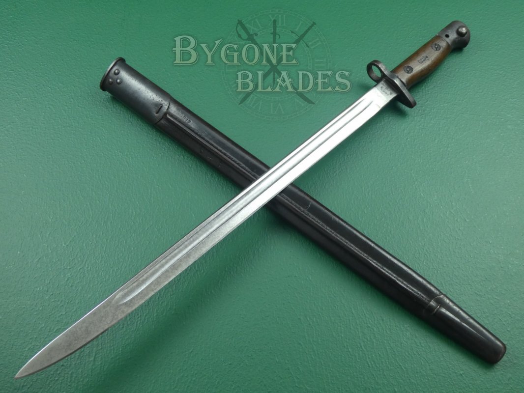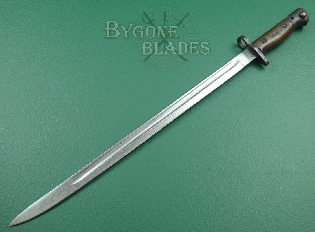 This is a very good example of the iconic British World War One Enfield rifle bayonet, made by the Wilkinson Sword Company and issued to the famous “London Scottish” who fought bravely throughout WW1.