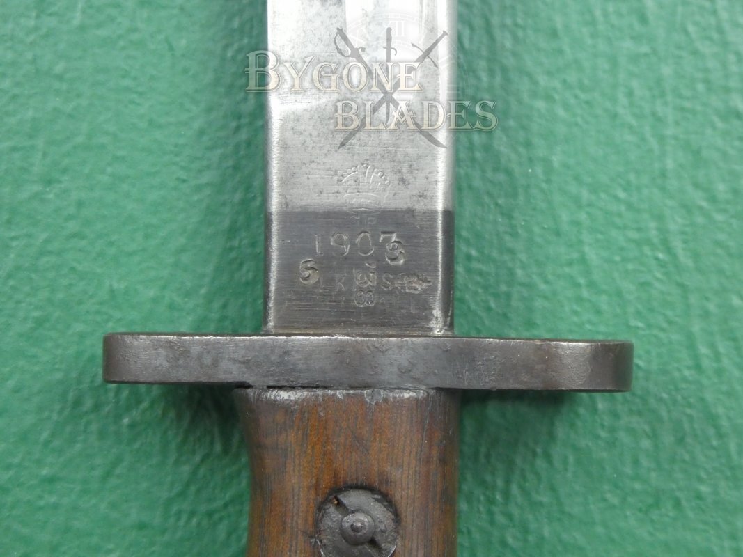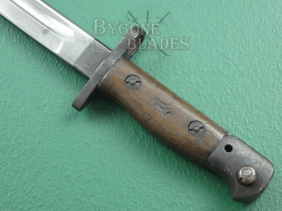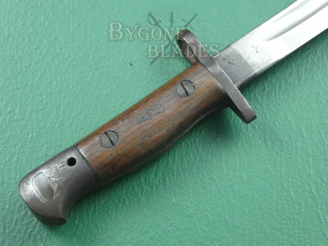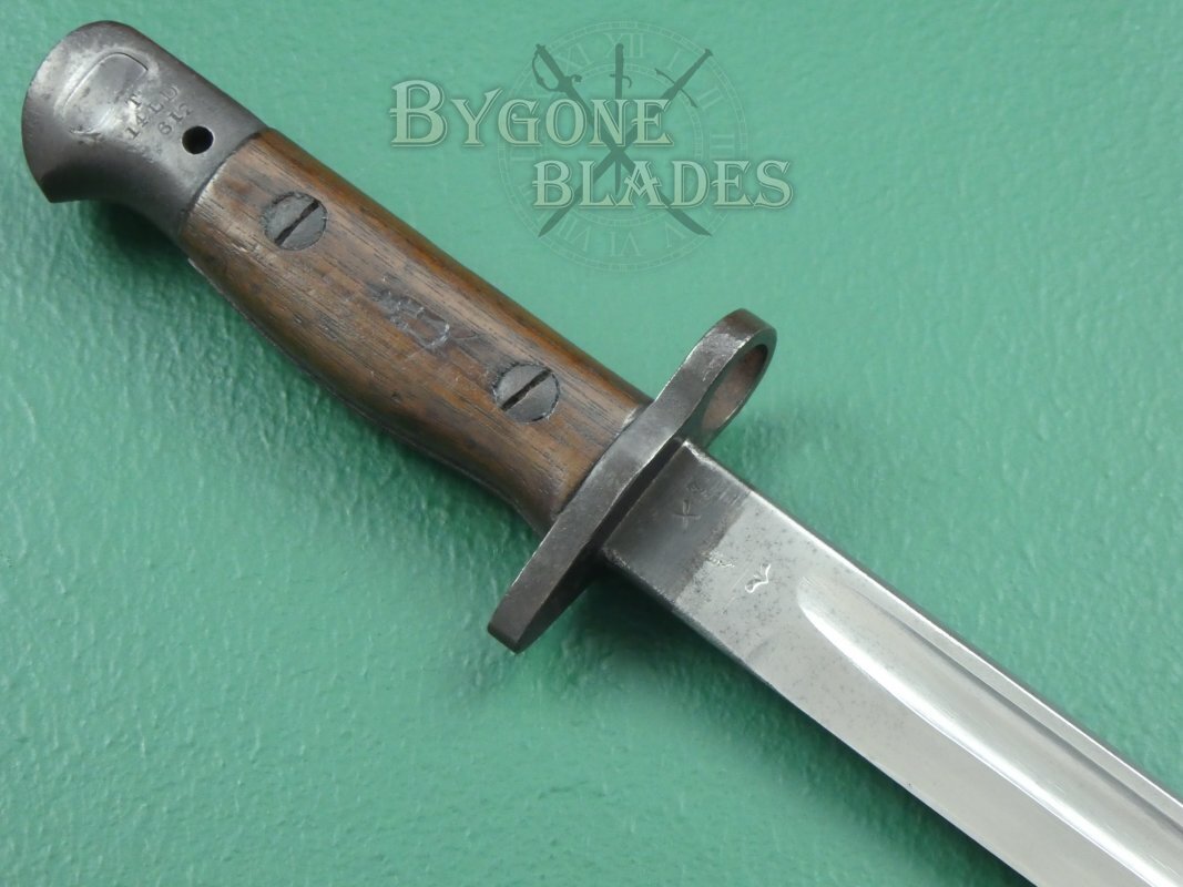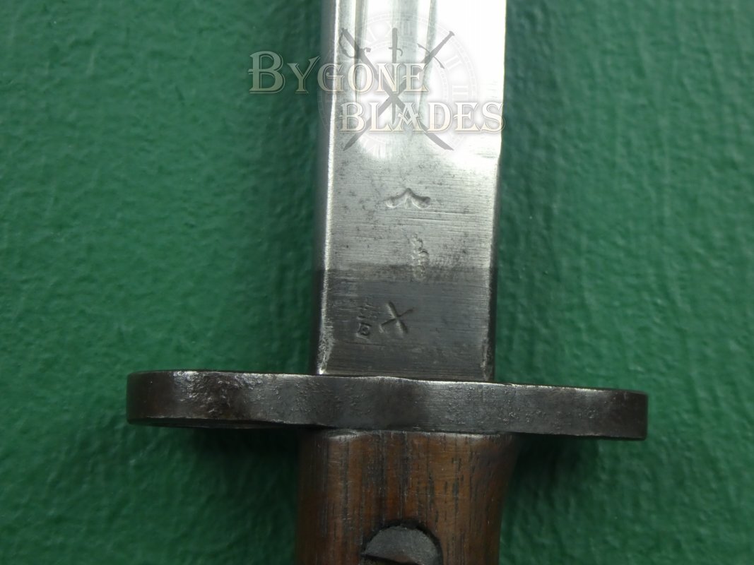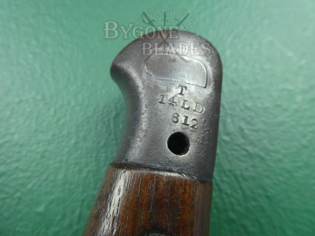 The crosspiece (with the hooked quillon officially removed), muzzle ring and pommel retain their original blued finish and are in good condition. The press-stud catch is in perfect working order. The pommel is stamped with the unit designation “T. 14. LD” over the weapon number 612. The pommel has a clearing hole that will have been added late into WW1, probably at the same time as the removal of the hooked quillon, and ties in with the 1917 date on the matching weapon numbered scabbard. It is likely that the bayonet was returned to the UK for refurbishment and re-issue after the death of the soldier to whom it was initially issued. The grip scales are in good condition and both bear crowned inspection stamps.