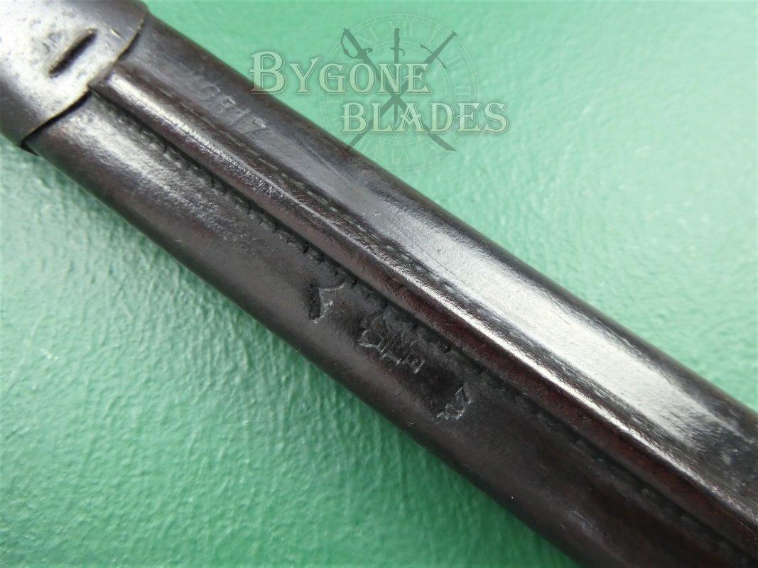 The bayonet is complete with its matching numbered late war (1917) leather scabbard with a round frog stud. The scabbard is in very good condition. The steel locket and chape retain their original blueing. The mouth of the locket is stamped with the number 612. The leather of the scabbard is stamped with a Broad Arrow, crowned Enfield inspection mark and the date 1917. The opposite side of the seam is stamped G.R. 17. The stitching is intact and strong and the bayonet sheathes smoothly and is held firmly within the scabbard.