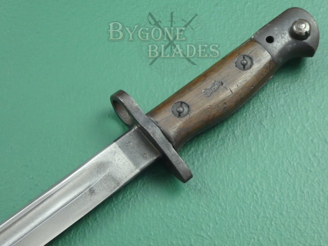 The obverse ricasso bears a bend test stamp, War Department arrow and two Enfield inspection and acceptance stamps.