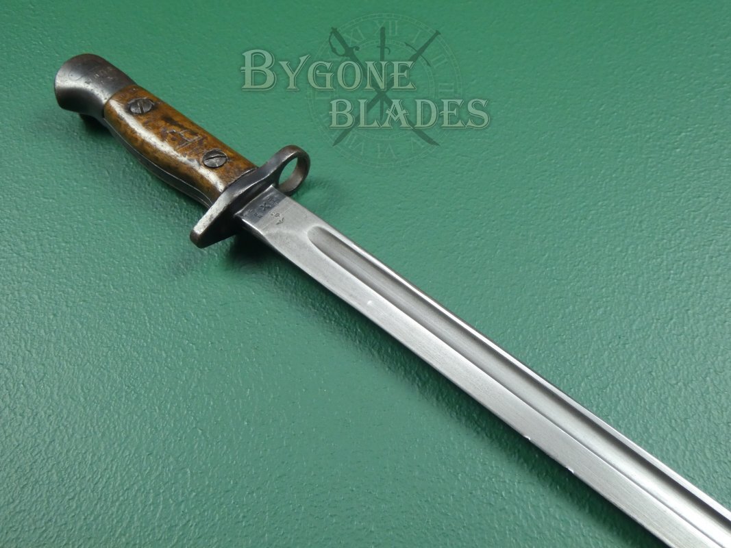 Iconic British WW1 Pattern 1907 bayonet made in 1909 by the Wilkinson Sword company. After service in WW1 the bayonet was blunted and used by a grammar school for drill training. Those boys will have gone on to fight in WW2.