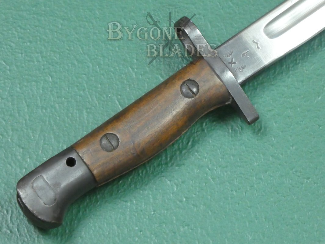 The obverse ricasso bears a bend test stamp, War Department arrow and three Enfield inspection and acceptance stamps.