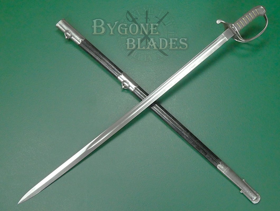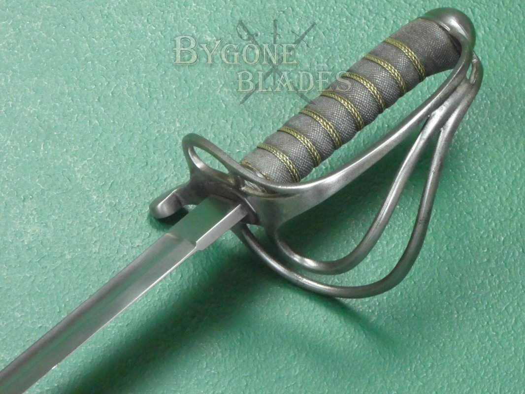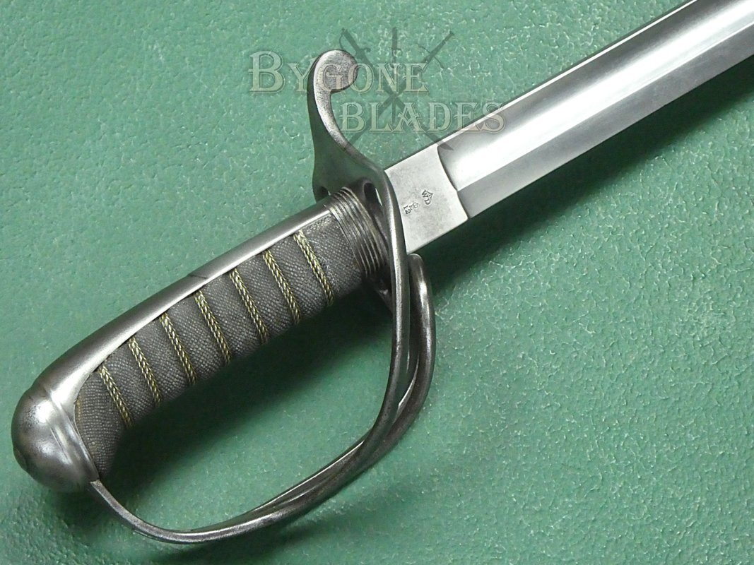 The 805mm single-edged blade is an almost straight version of the 1845 pattern “Wilkinson” blade. The blade has a flat spine above a deep single fuller and terminates in a double-edged spear point. The blade measures 30mm wide at the ricasso and has an 8mm thick spine.