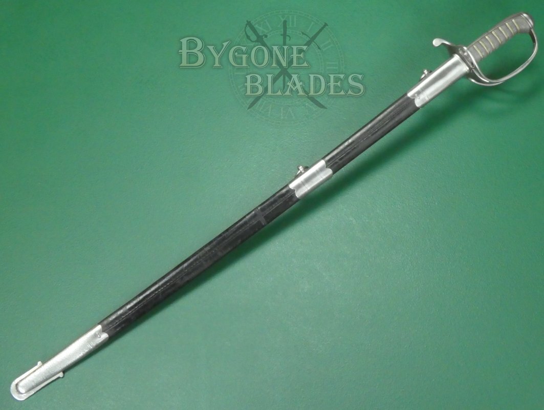 The sword is complete with its black leather scabbard with polished steel mounts. The bottom mount has some cleaned pitting. The leather is in good condition and retains its original finish with small losses. The stitched seam is intact and tight. The sword sheathes and draws smoothly and is held firmly within the scabbard.