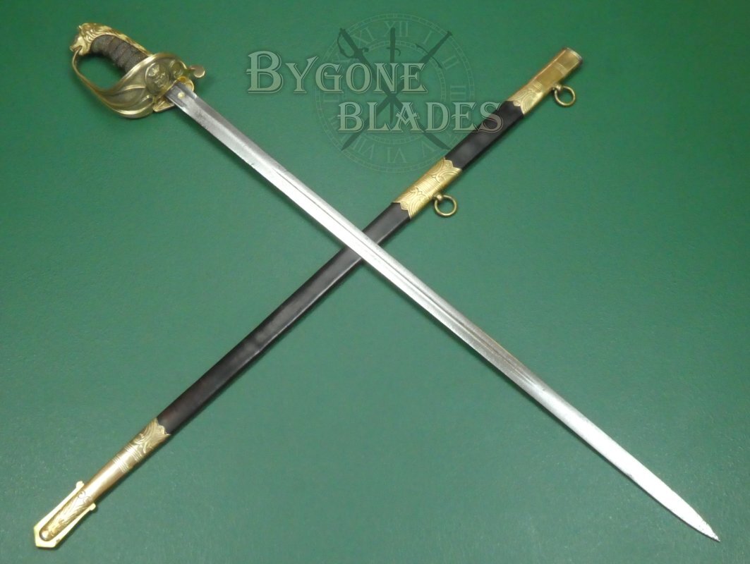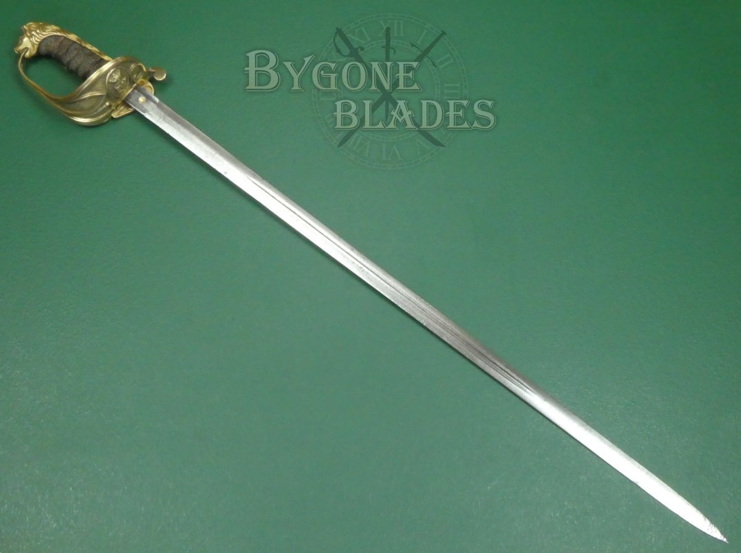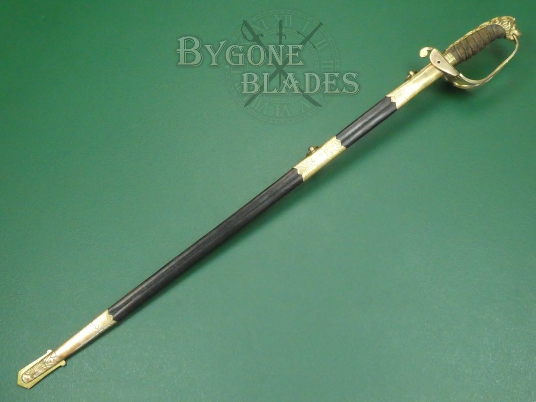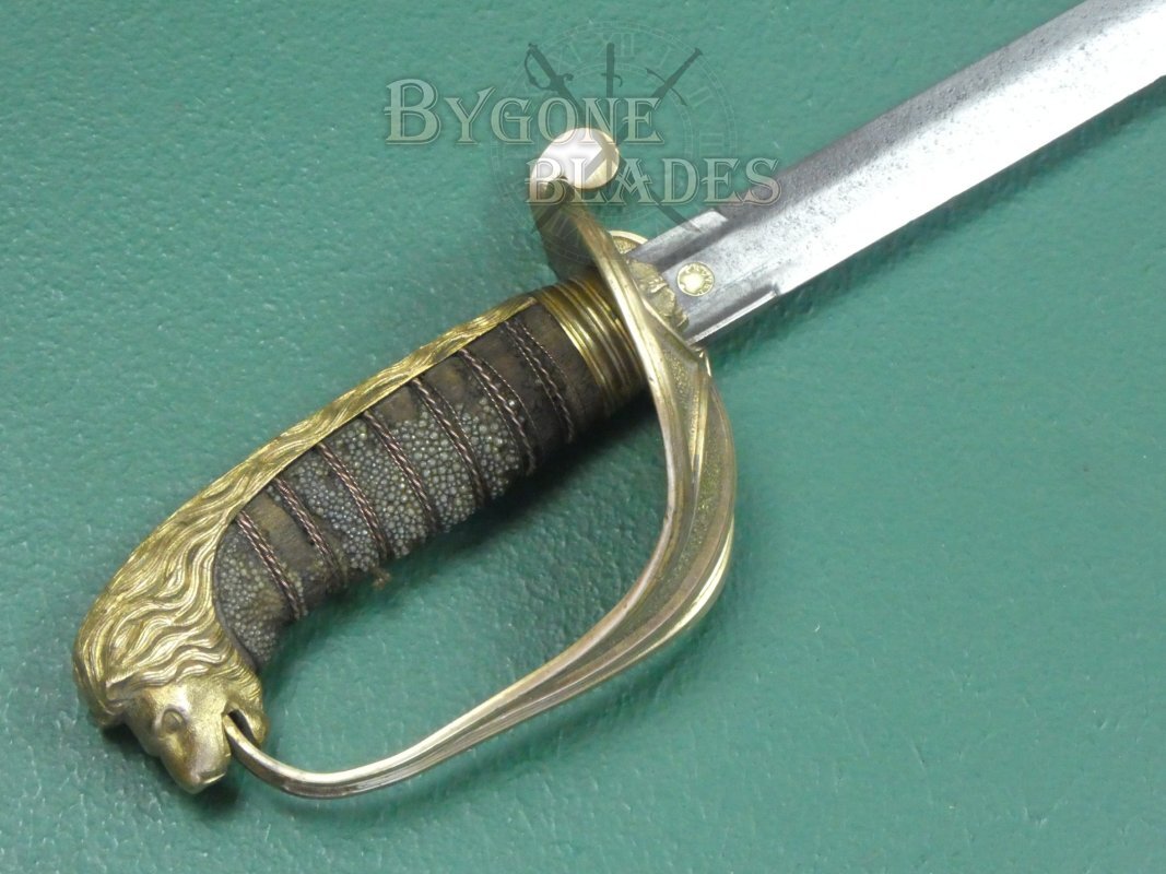 The mane of the highly detailed lion head pommel runs the full length of the back strap and the “D” guard extends from between the lion’s jaws. This helps date the sword to mid-19th Century. The ray skin grip is mostly absent. The twisted copper wire is present and correct. The blade is firm in the hilt.