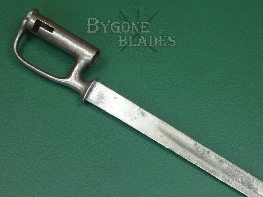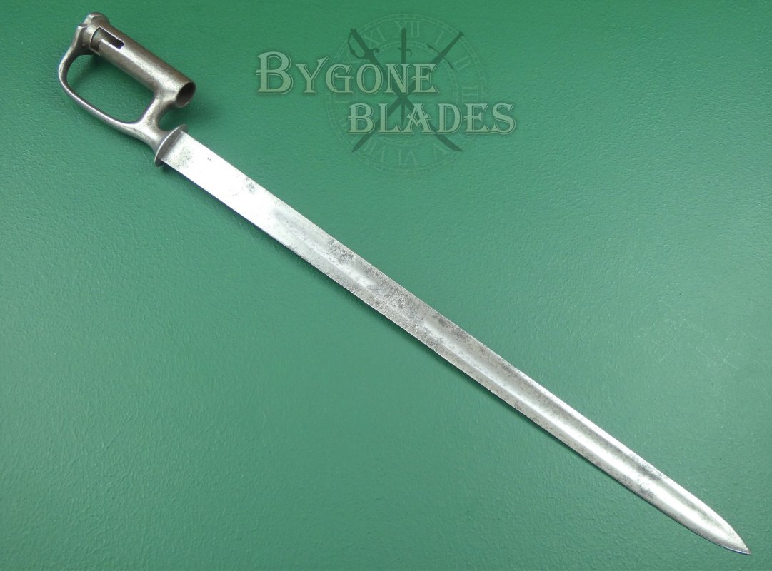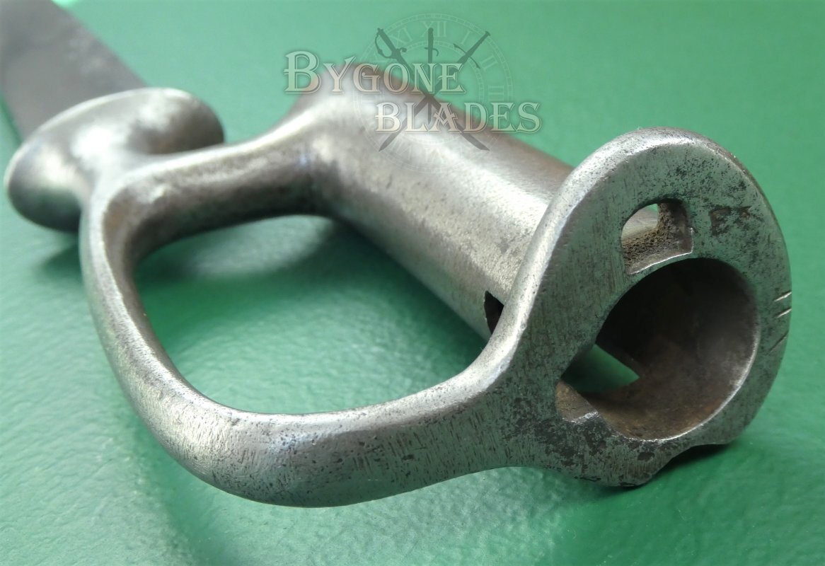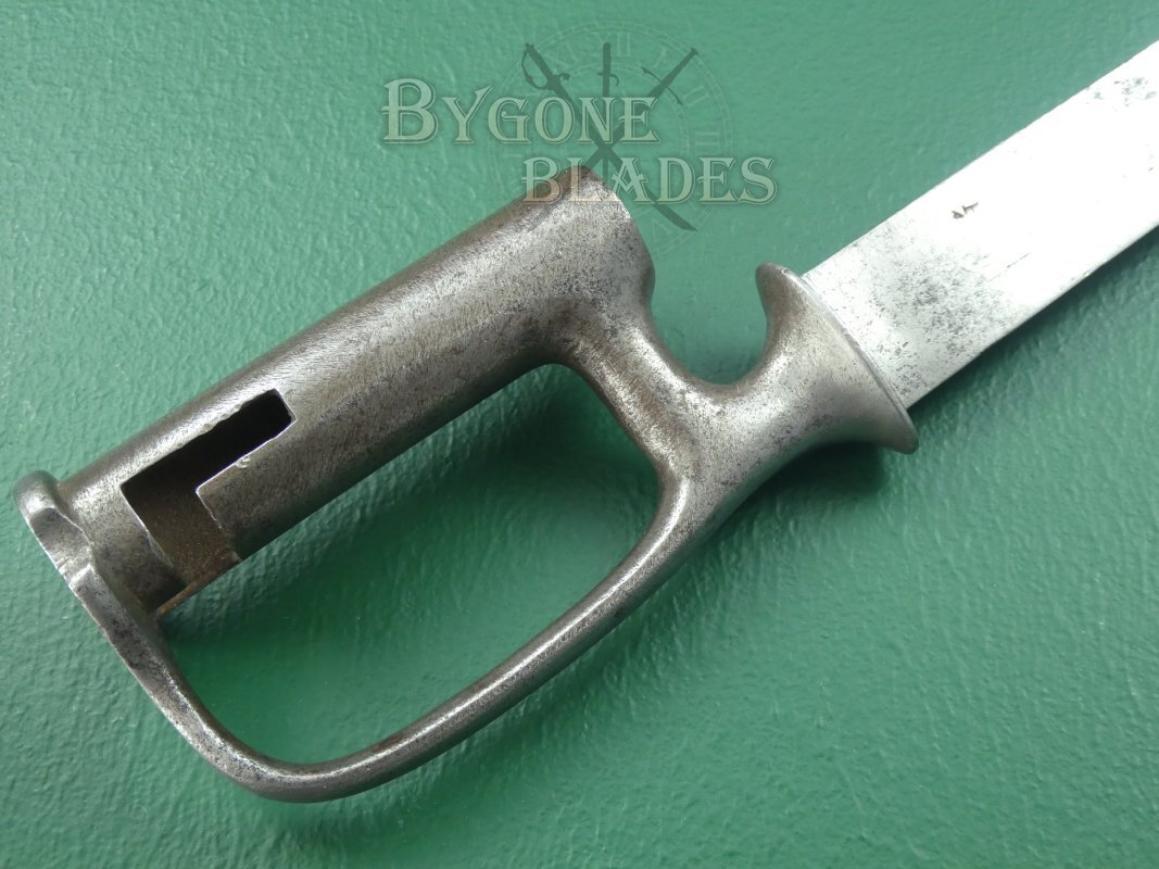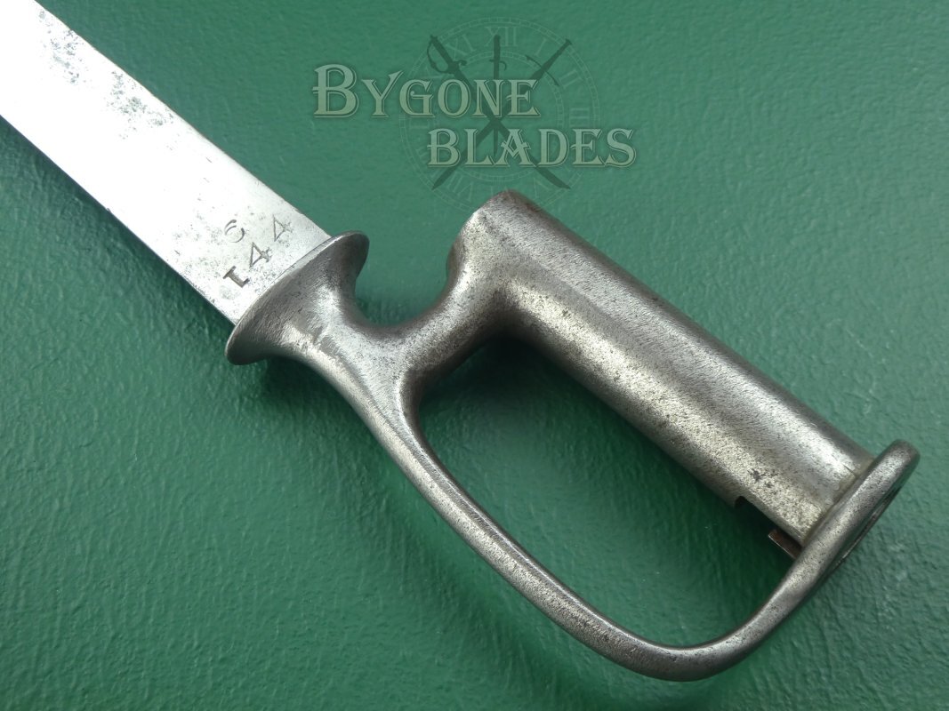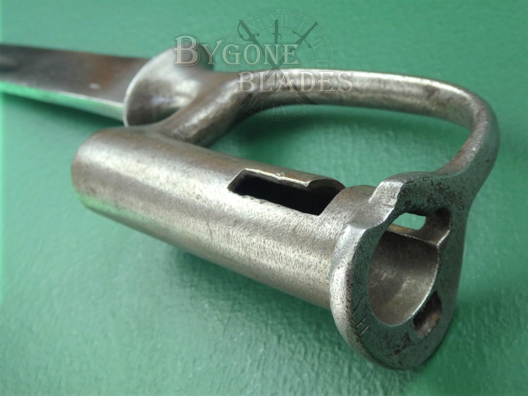 This is a rare British East India Company (E.I.C.) 1841 pattern India catch Sapper and Miner’s sword bayonet. Designed to fit the E.I.C. pattern Sapper’s and Miner’s Carbine. The bayonet fixes horizontally on the side of the musket with the E.I.C. catch, as opposed to vertically, underneath the barrel as with earlier models. The rim of the socket has a sighting notch at right angles to the knuckle bow. These bayonets were made in the UK and supplied to the E.I.C. by several English makers.