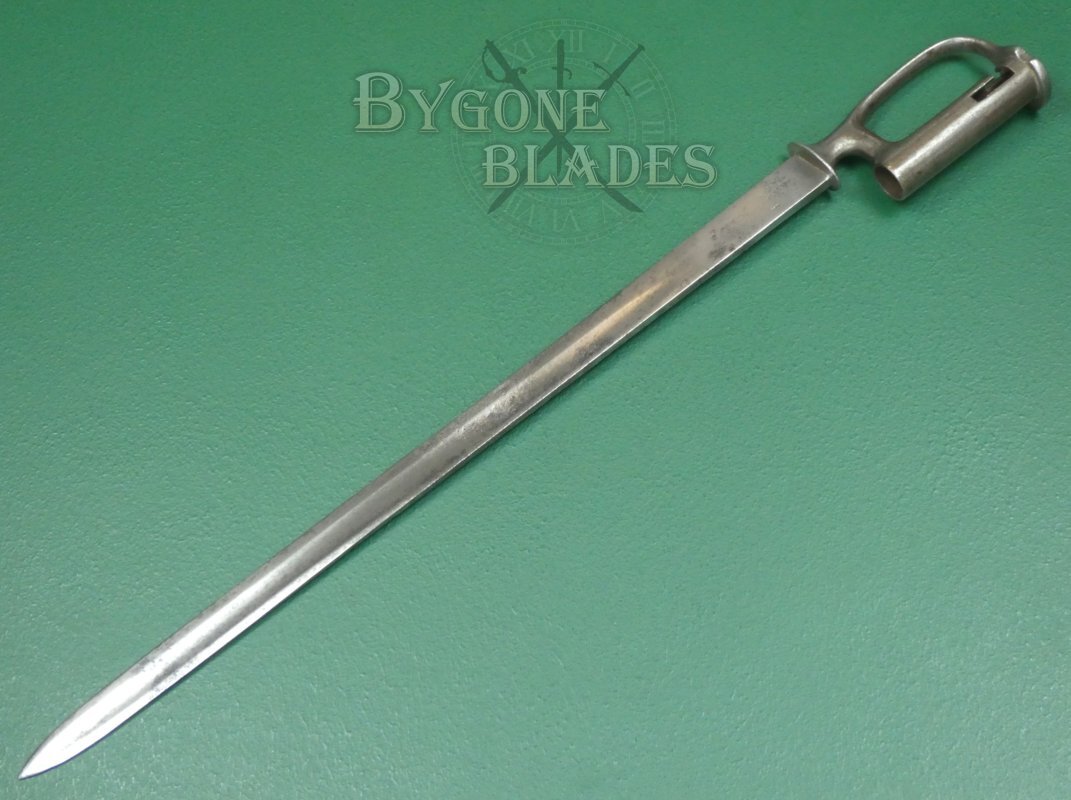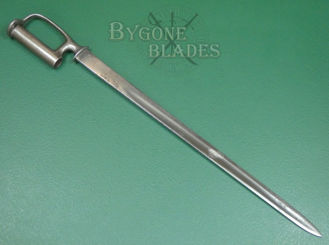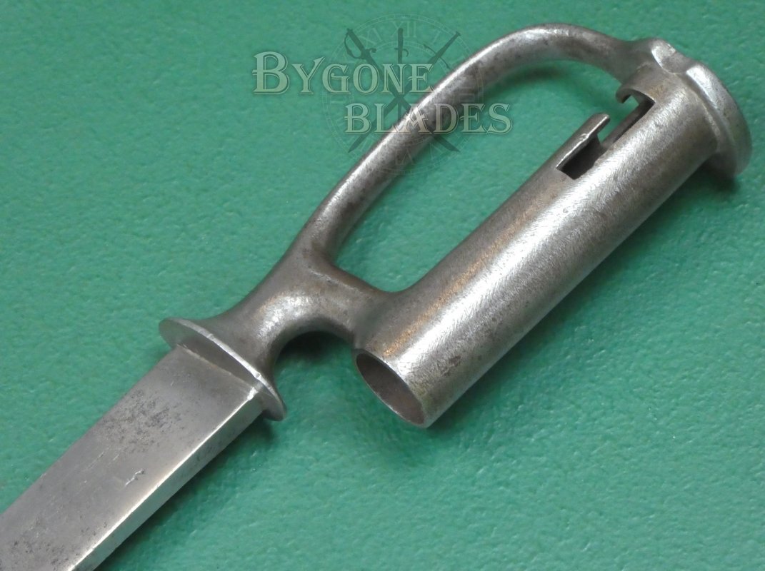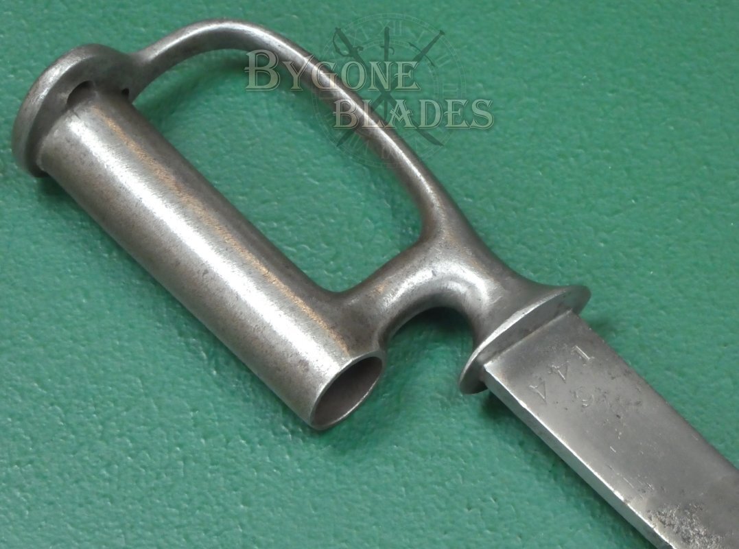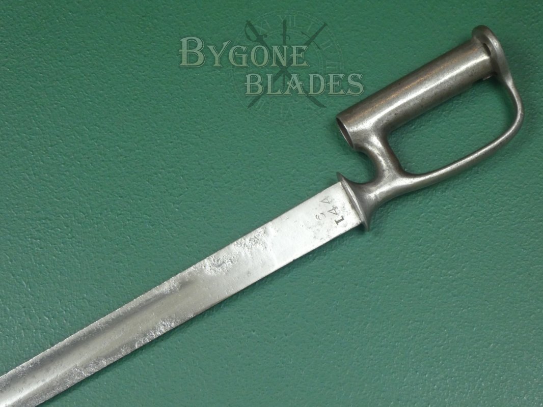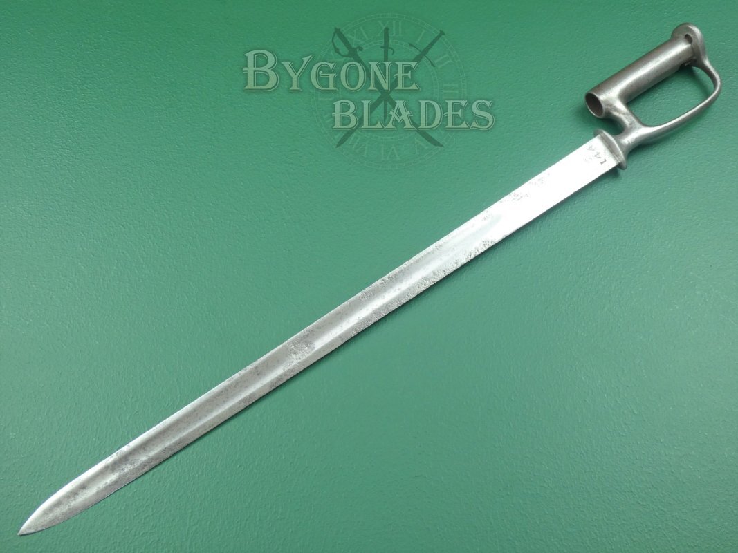This is a rare British East India Company (E.I.C.) 1841 pattern India catch Sapper and Miner’s sword bayonet. Designed to fit the E.I.C. pattern Sapper’s and Miner’s Carbine. The bayonet fixes horizontally on the side of the musket with the E.I.C. catch, as opposed to vertically, underneath the barrel as with earlier models. The rim of the socket has a sighting notch at right angles to the knuckle bow. These bayonets were made in the UK and supplied to the E.I.C. by several English makers.
