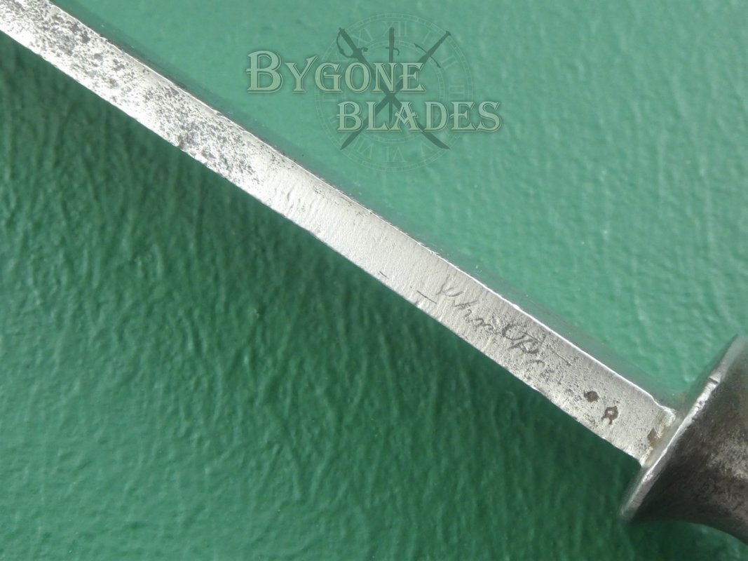 The spine is stamped with a worn maker’s name and the forte bears an inspectors’ stamp of a letter (H?) over the number “4.” The obverse of the forte is stamped with a 6 over 144, which is the E.I.C. unit designation and weapon number. The front of the socket is stamped with E3 and has three incised lines.