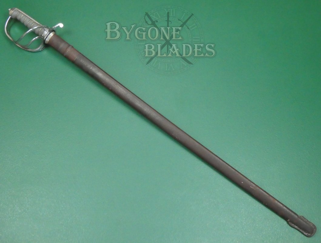 The 1901 pattern brown leather covered scabbard is in good condition but lacks its frog strap. There are age and use related scuffs and marks. The sword sheaths and draws smoothly and is held firmly in the scabbard.